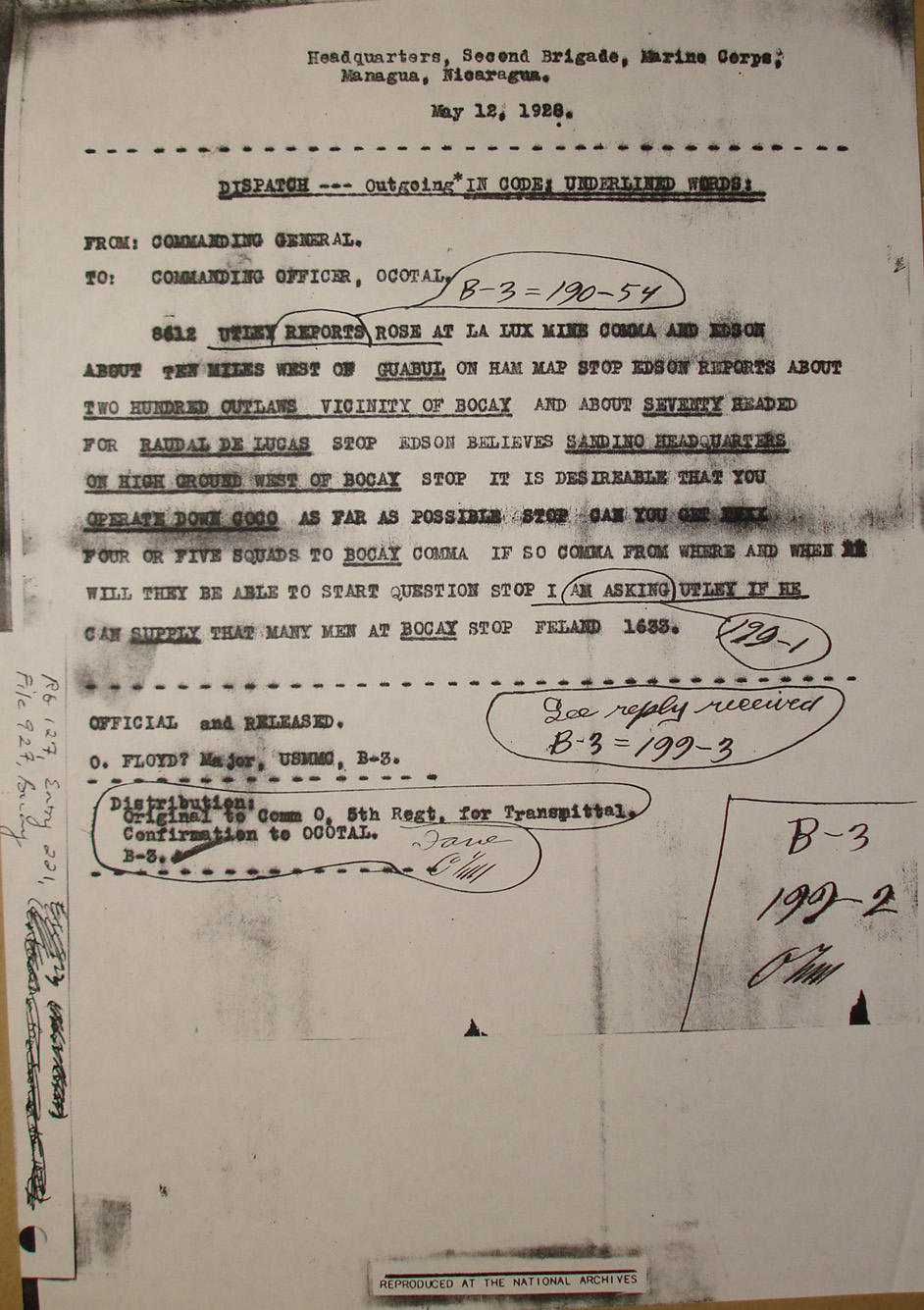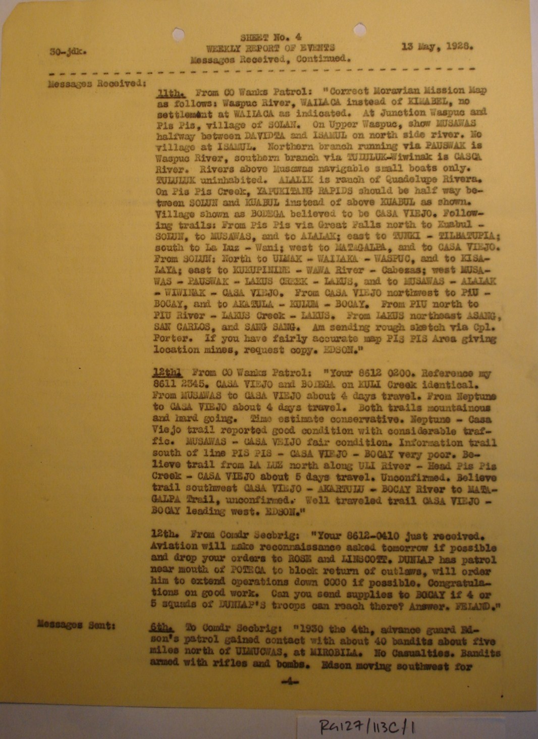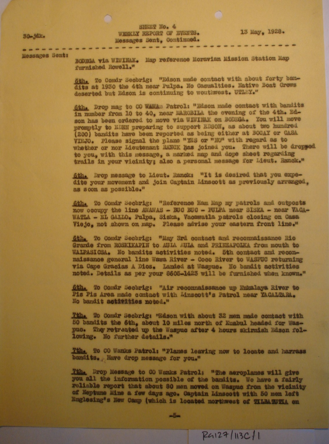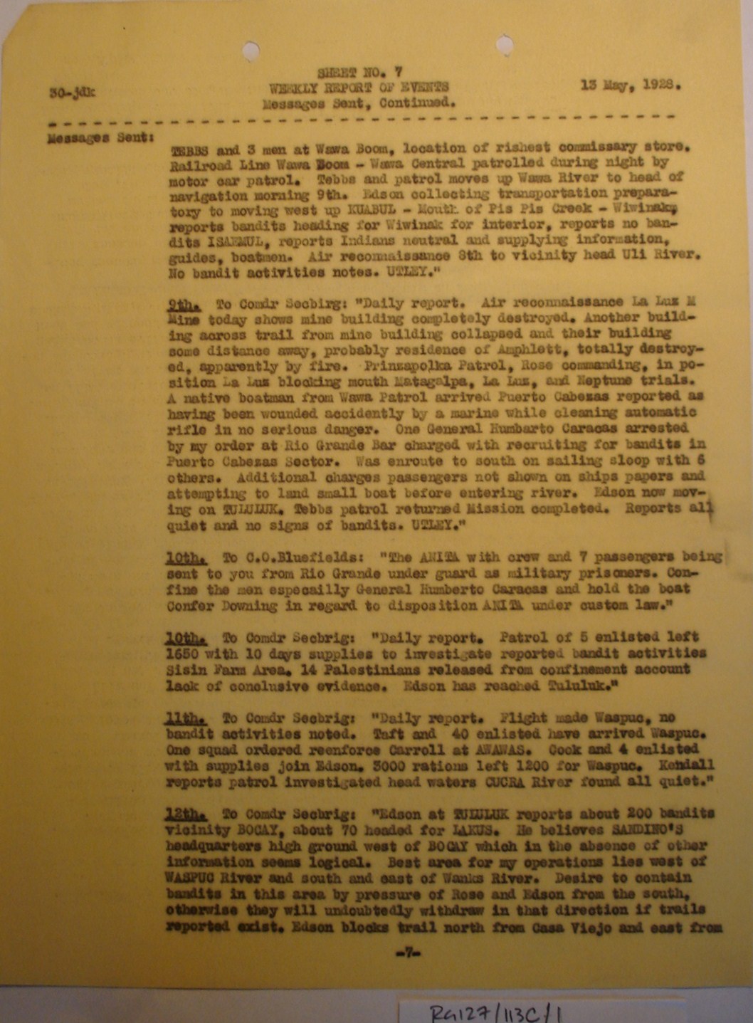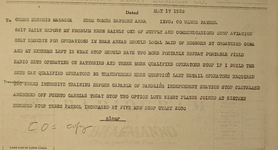 Radiogram from Capt. M. A. Edson, Wanks River Patrol,