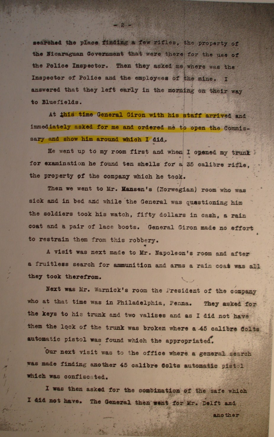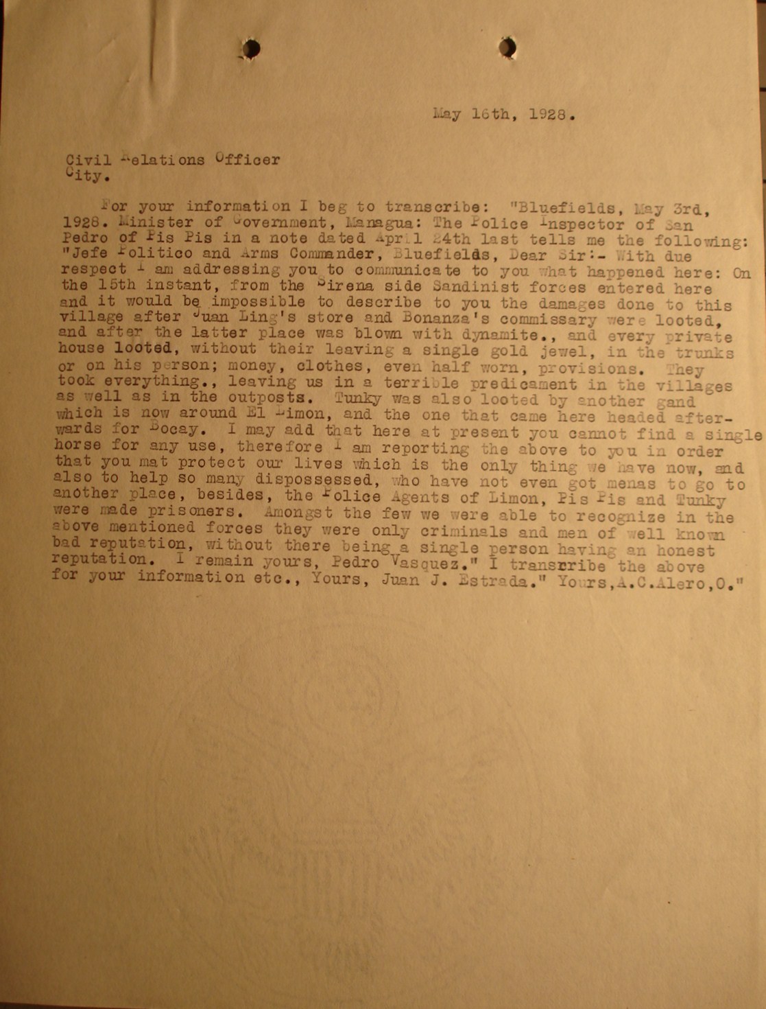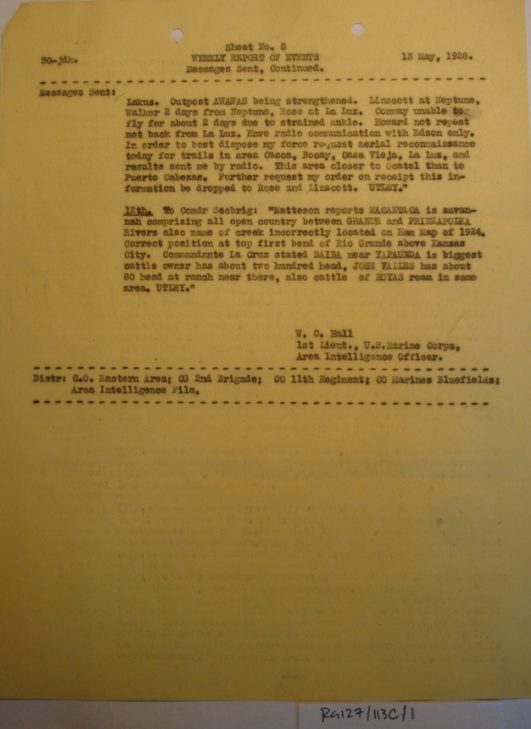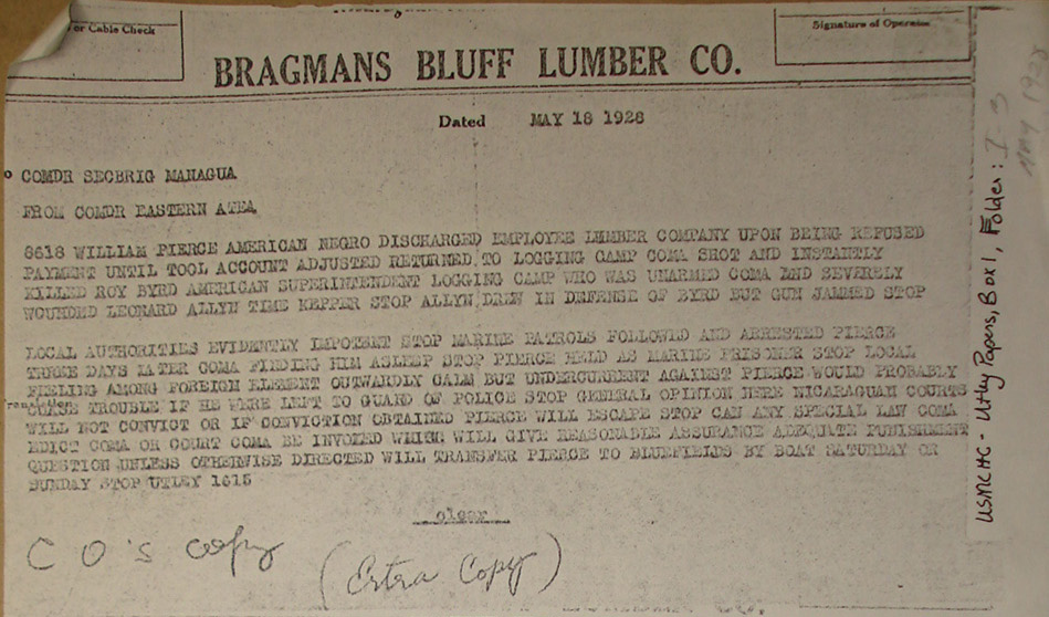 to Major H. H. Utley, Puerto Cabezas.