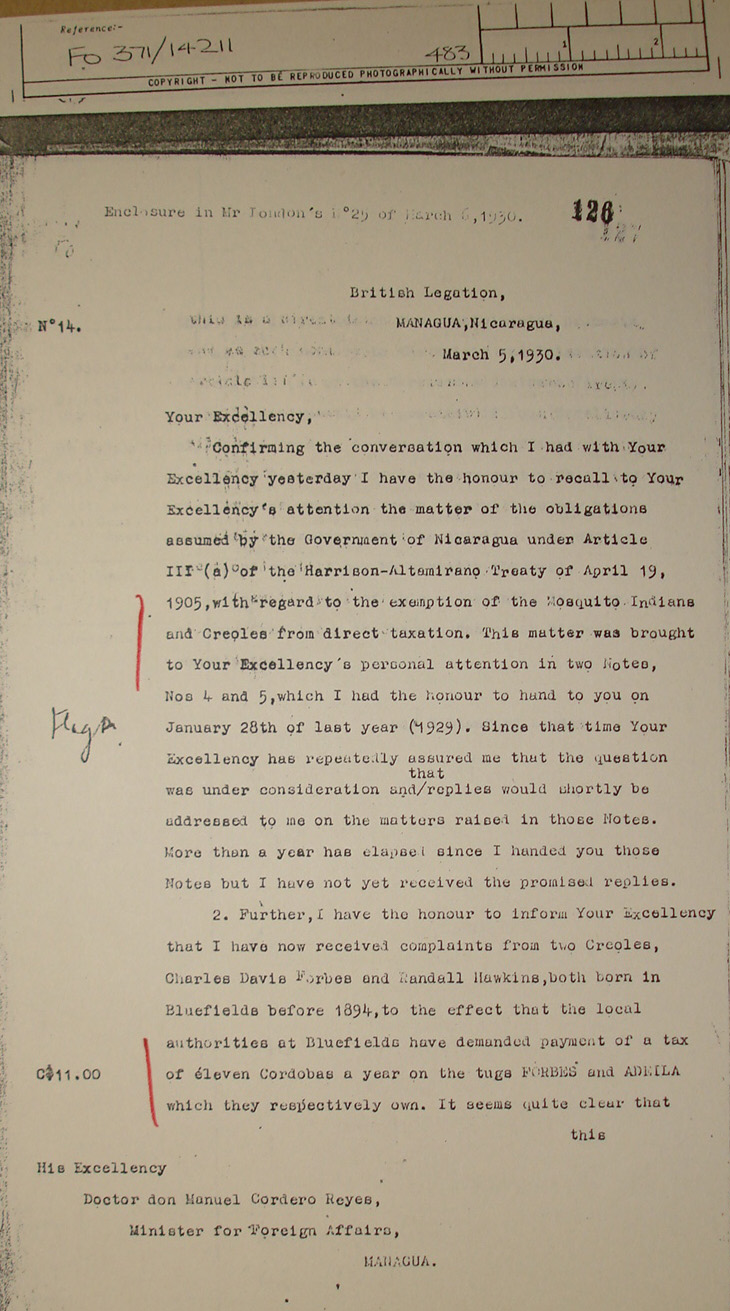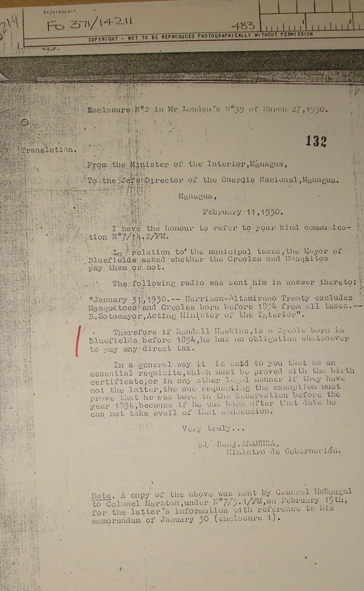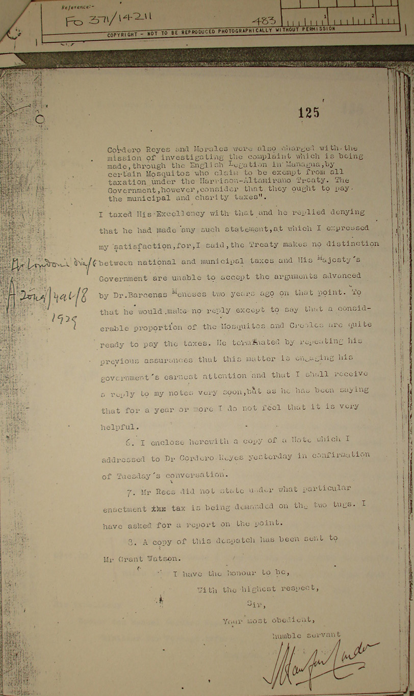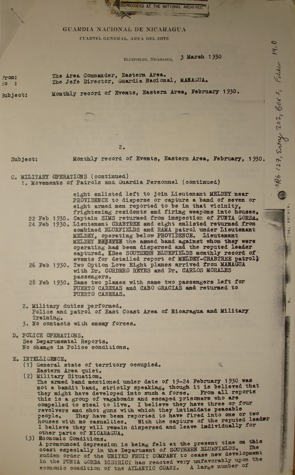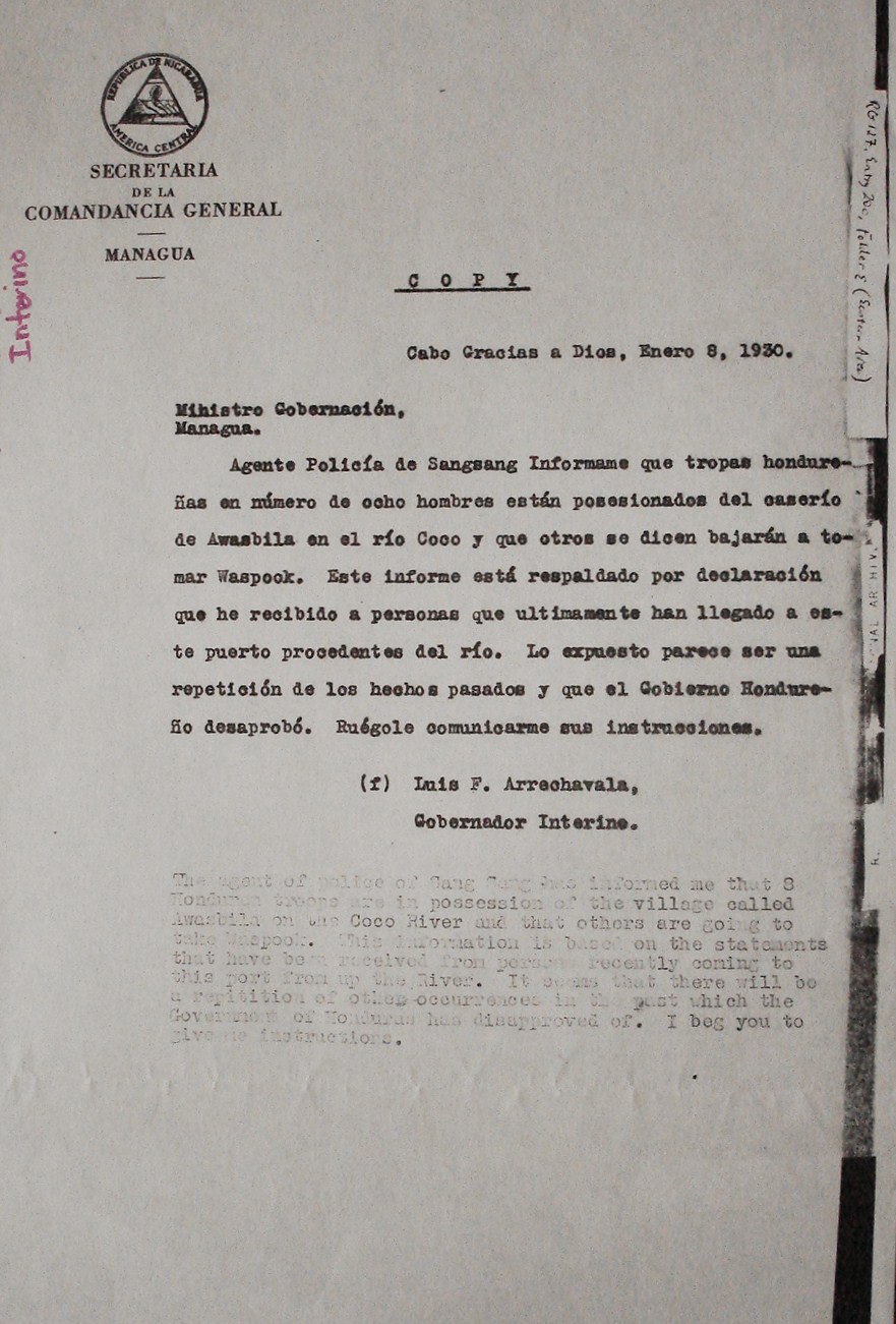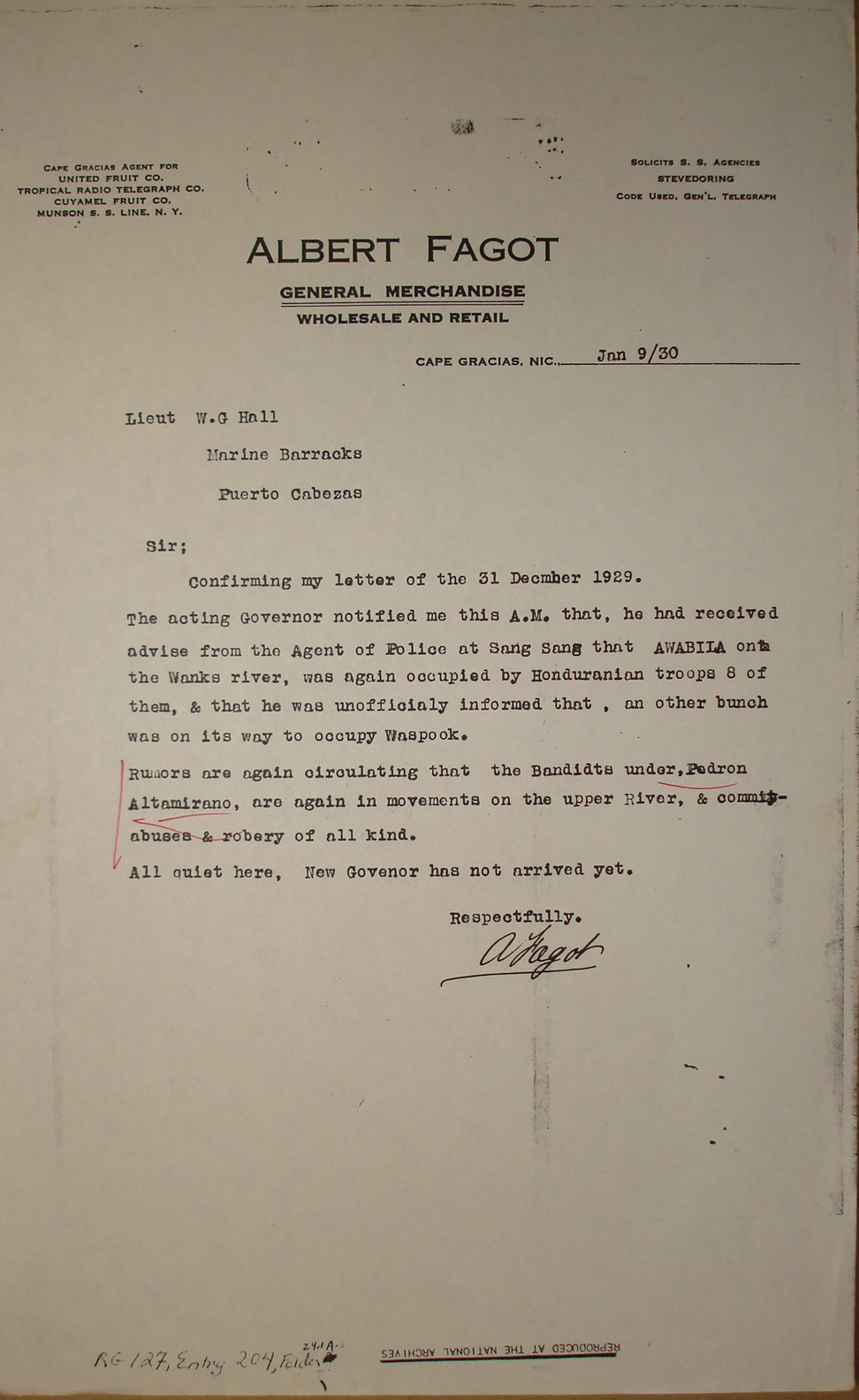 Dios, to Lt. W. C. Hall, Puerto Cabezas.