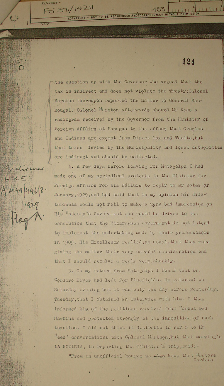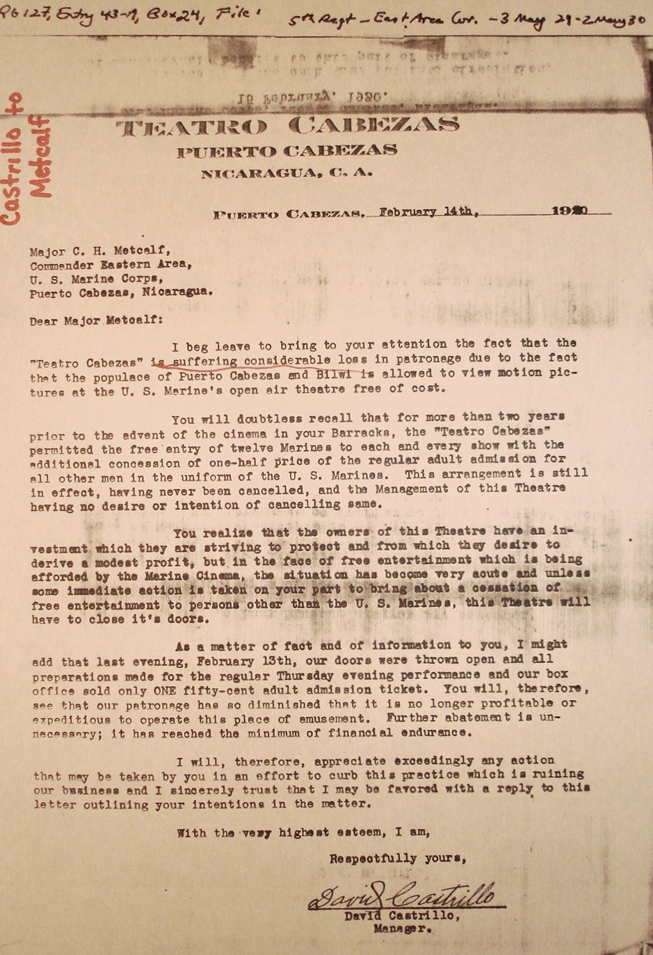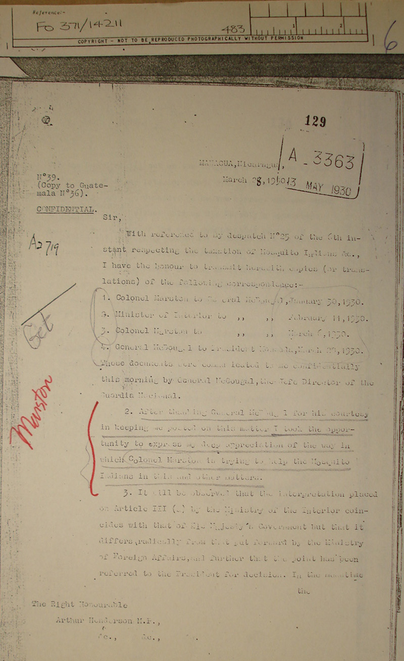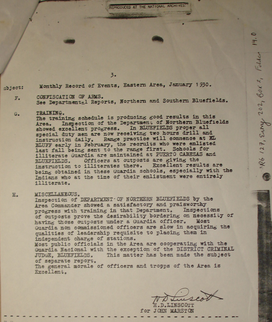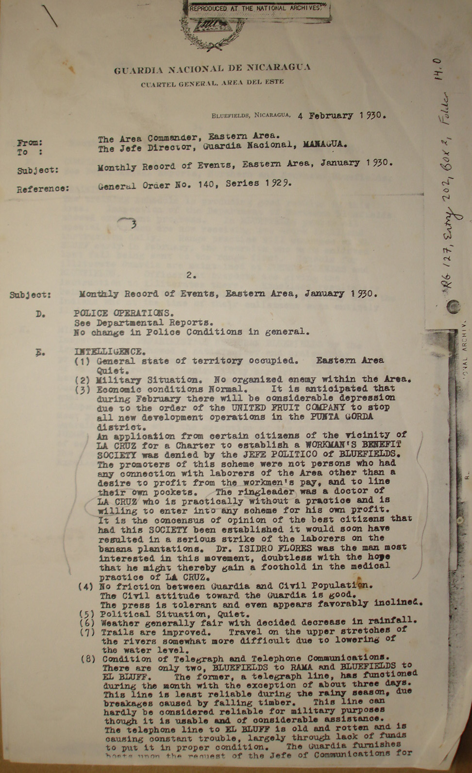 Dios, to Lt. W. C. Hall, Puerto Cabezas.