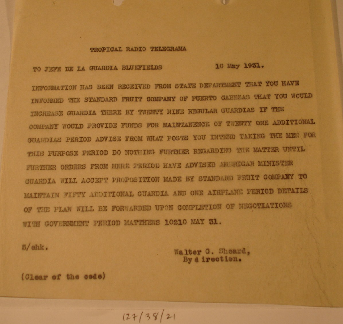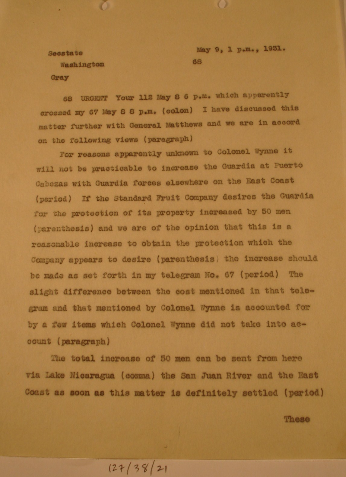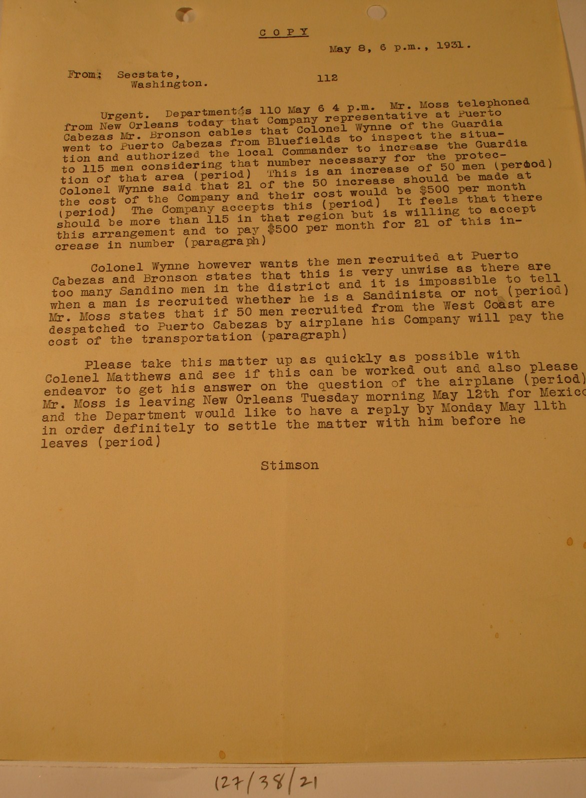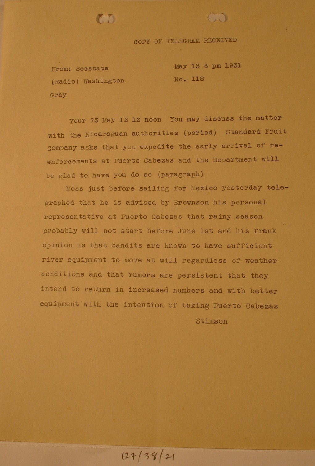 to Sec. State Henry Stimson, Washington