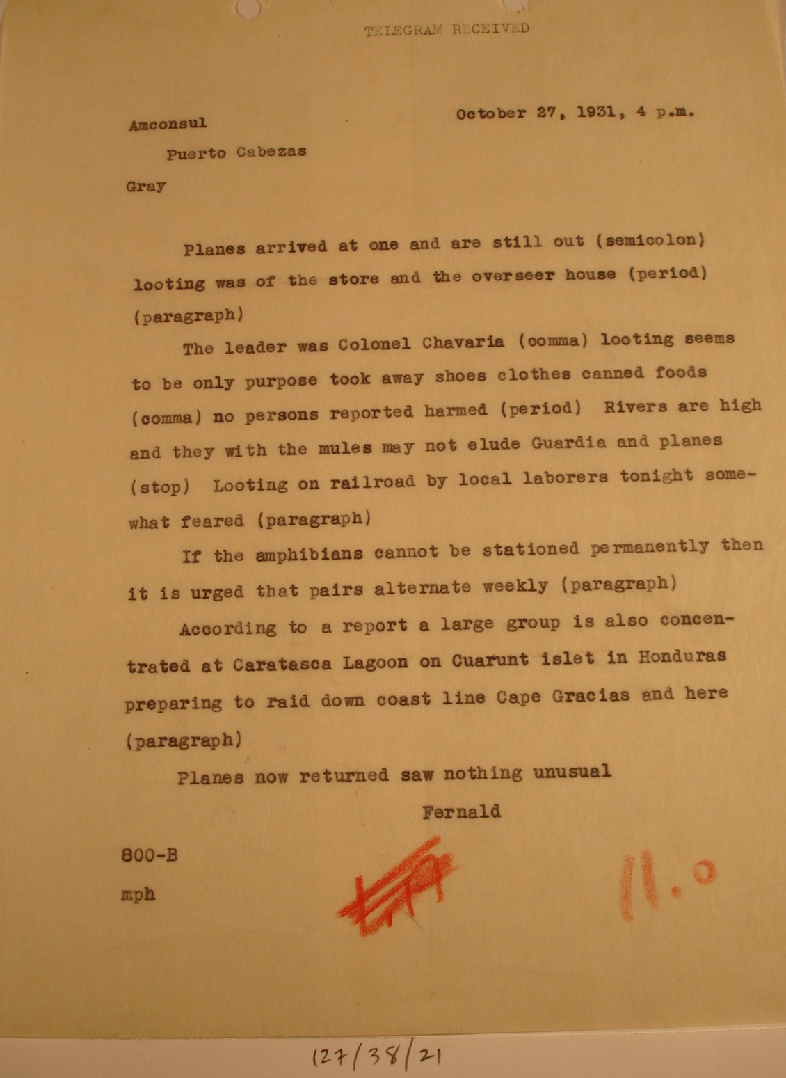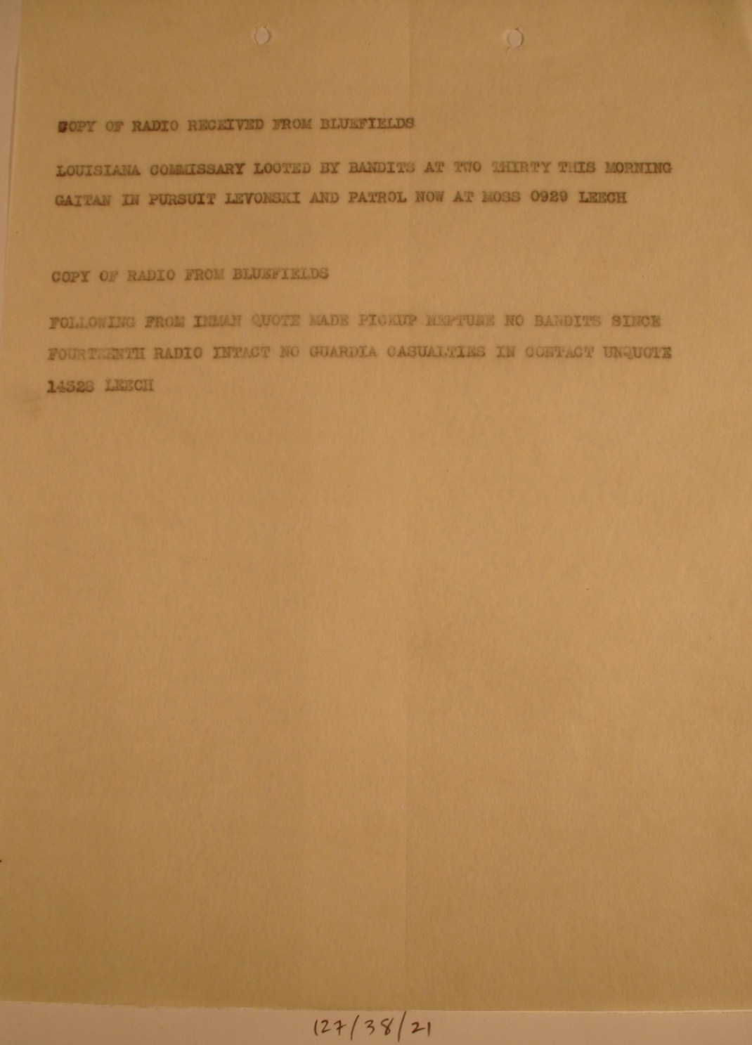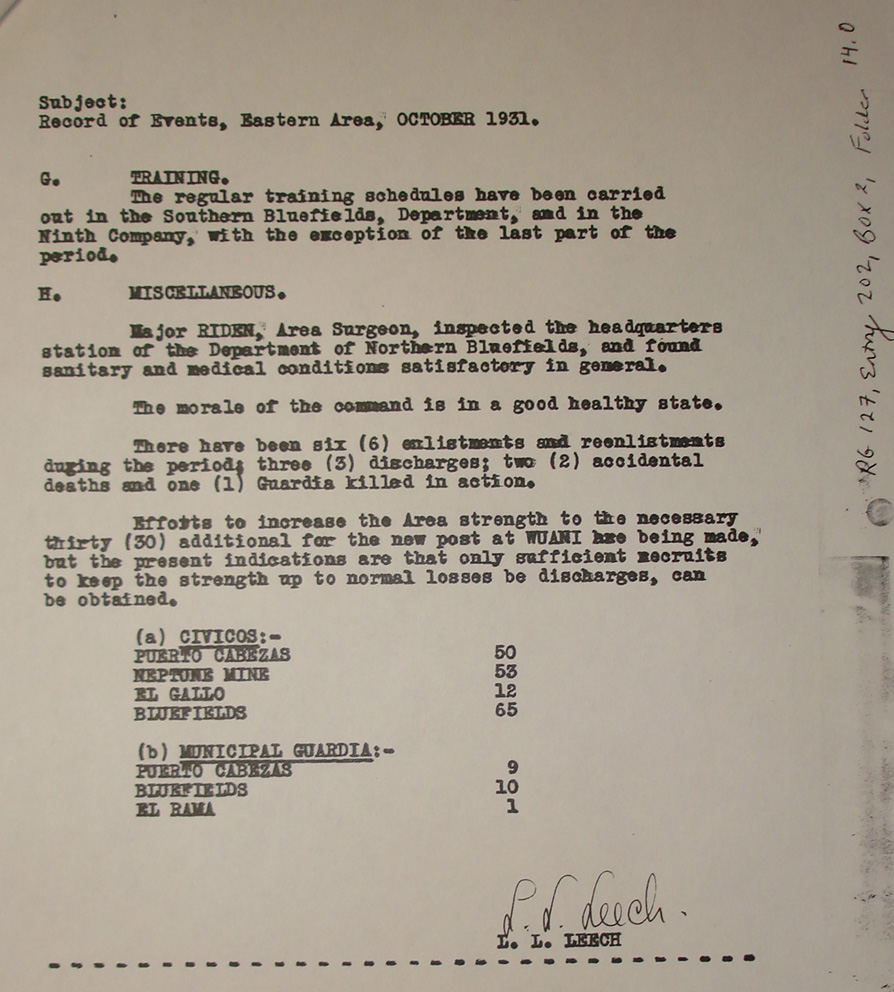 Puerto Cabezas, to Col. L. L. Leech,