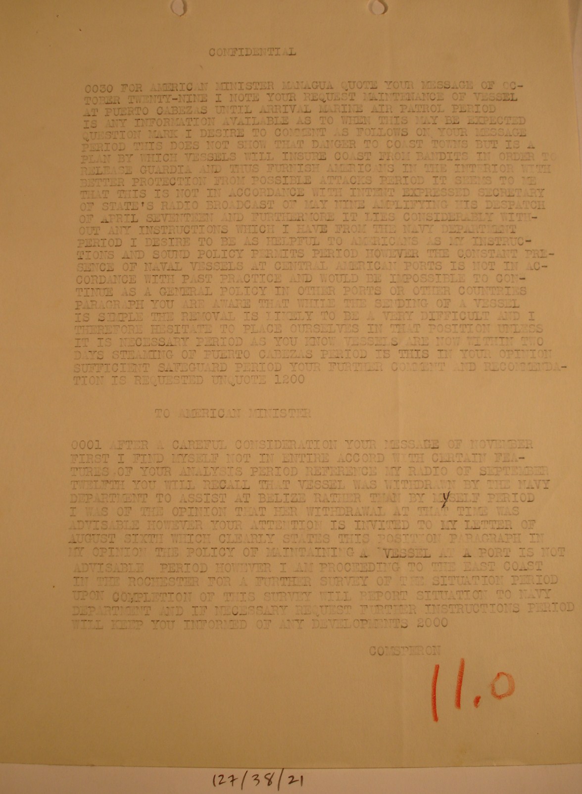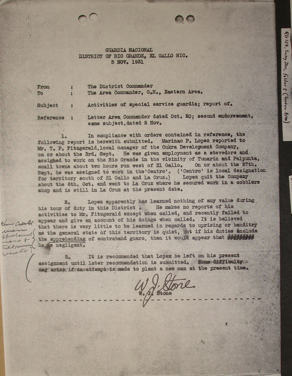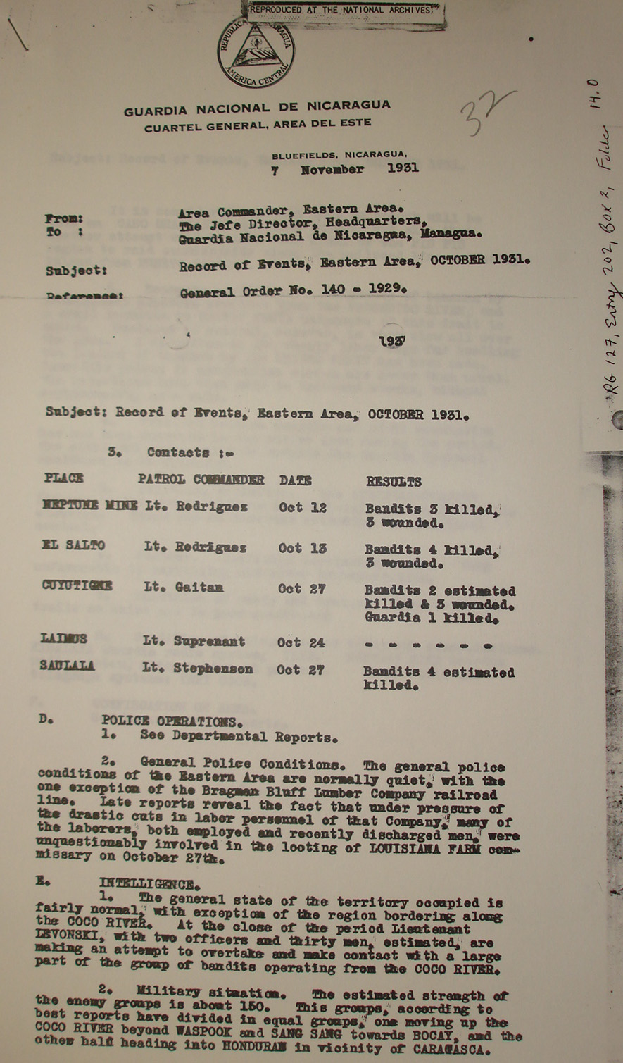 Puerto Cabezas, to Col. L. L. Leech,