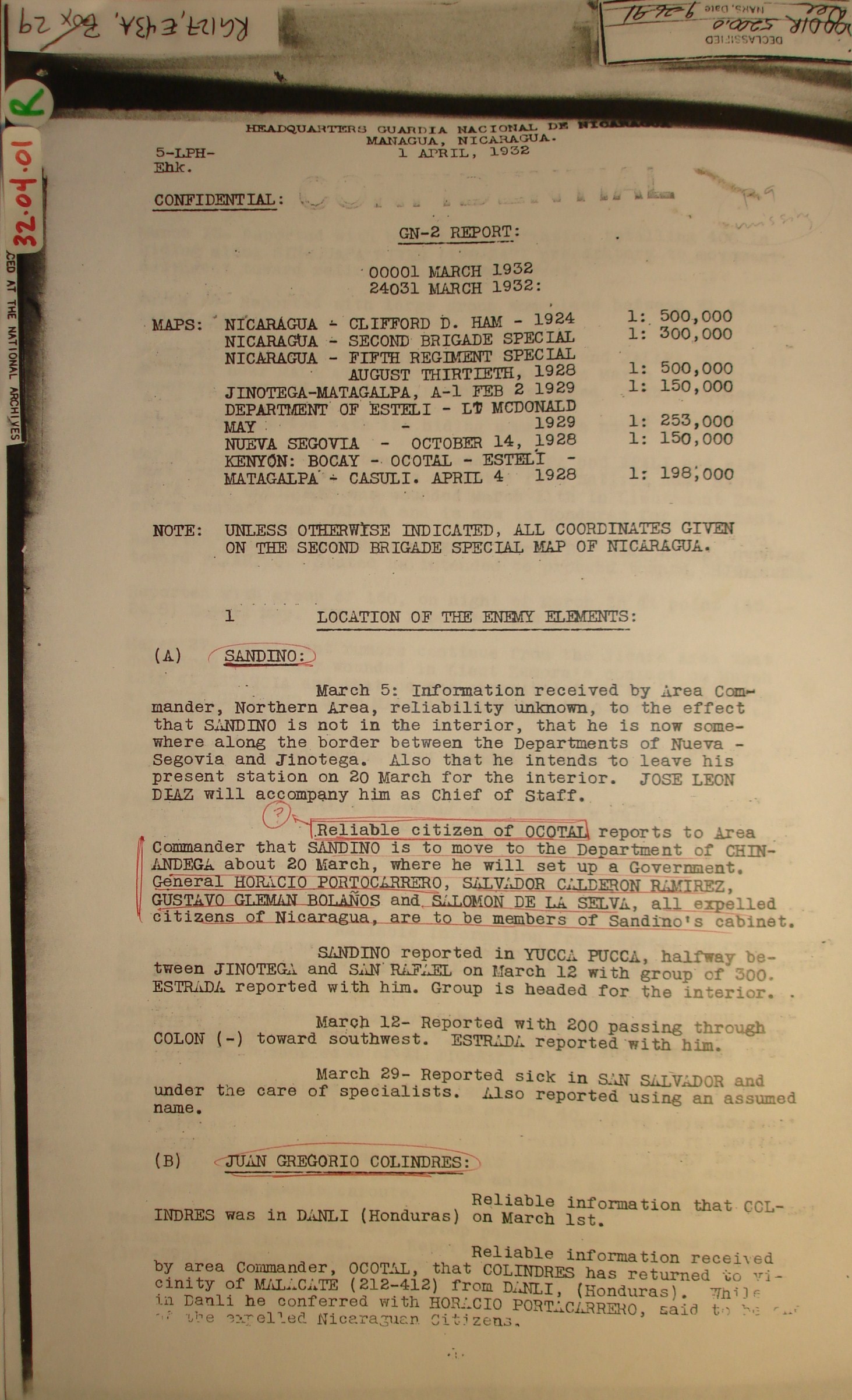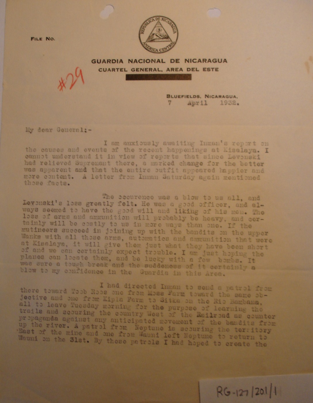 April 28, Sandino writes to Gen.