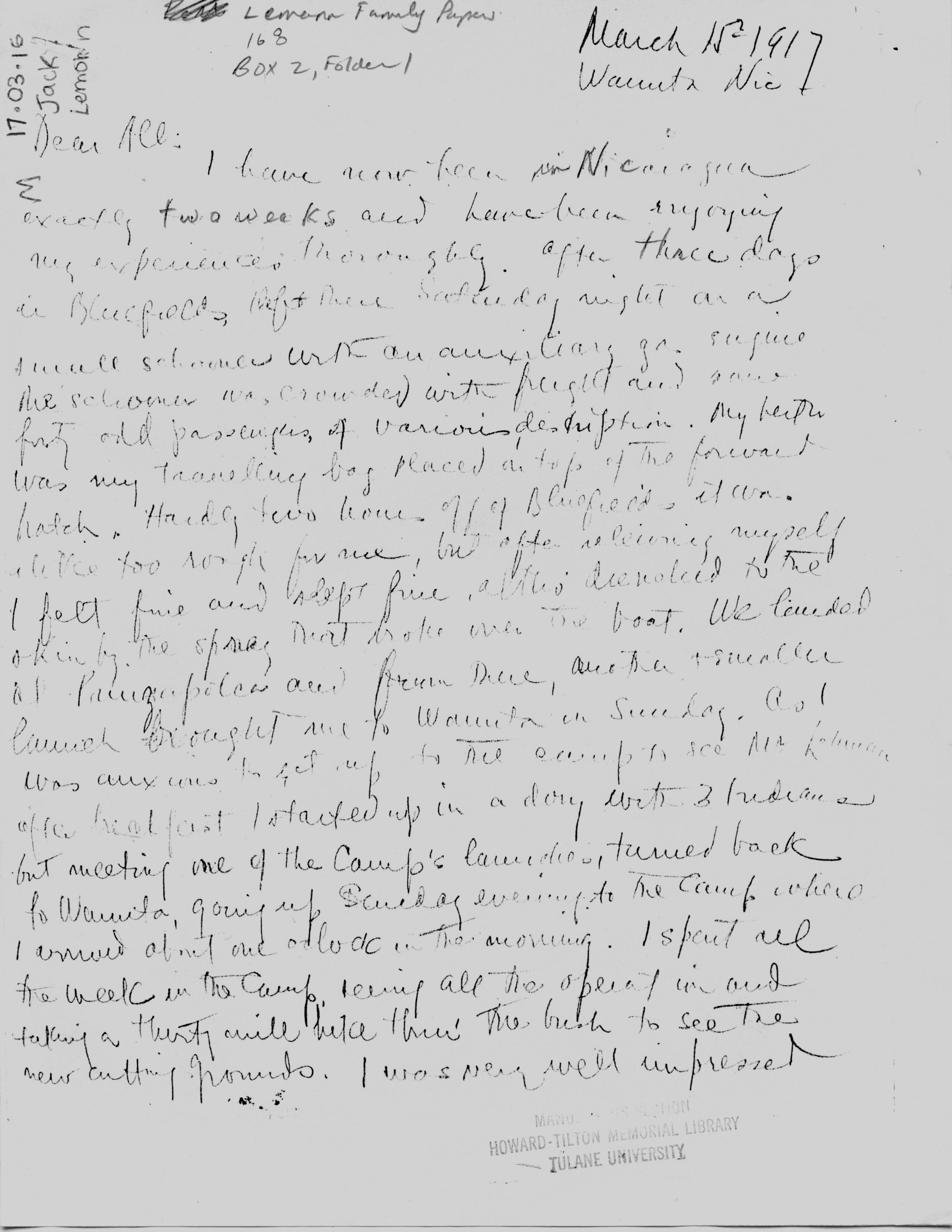 Jack Lemann, Waunta, Nicaragua, to "All," p. 1.