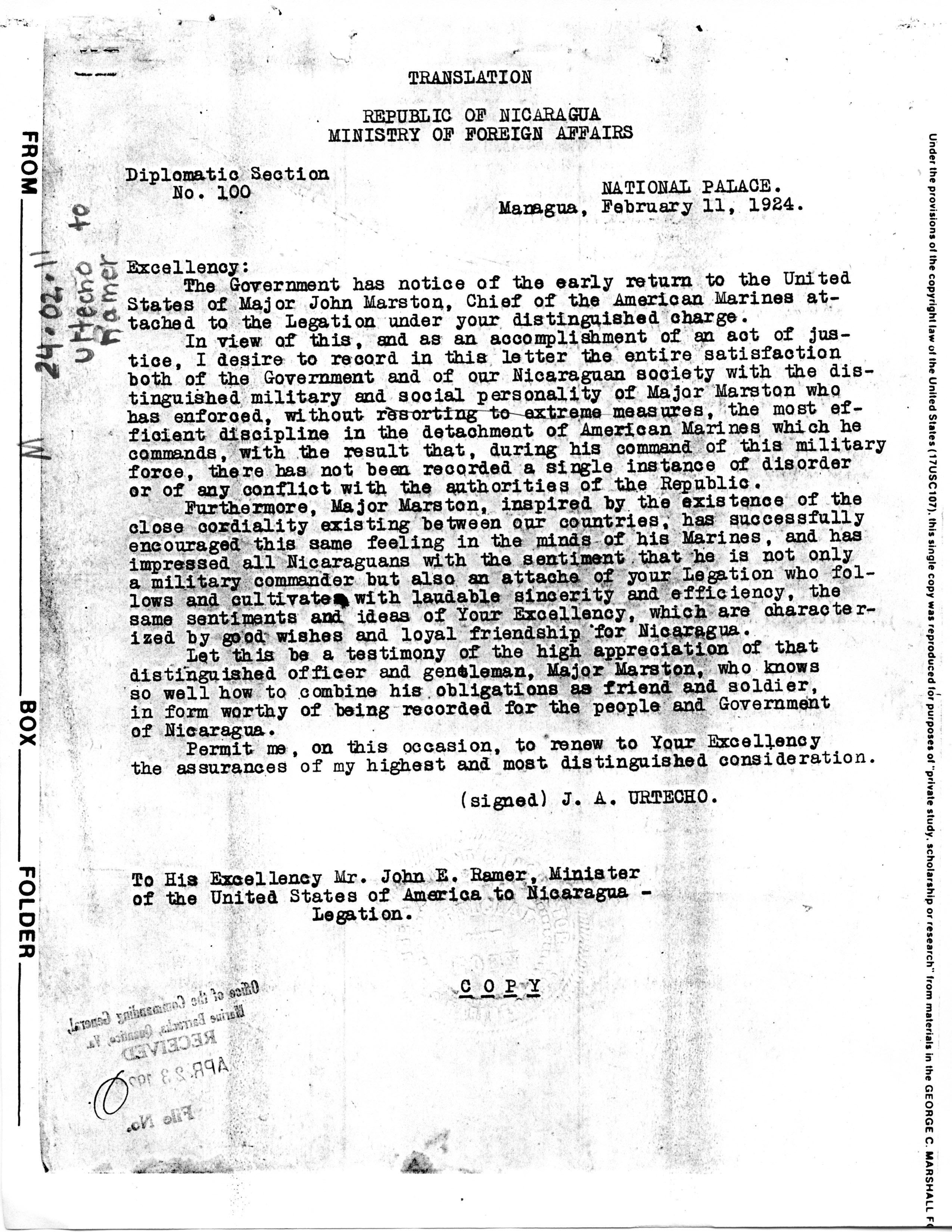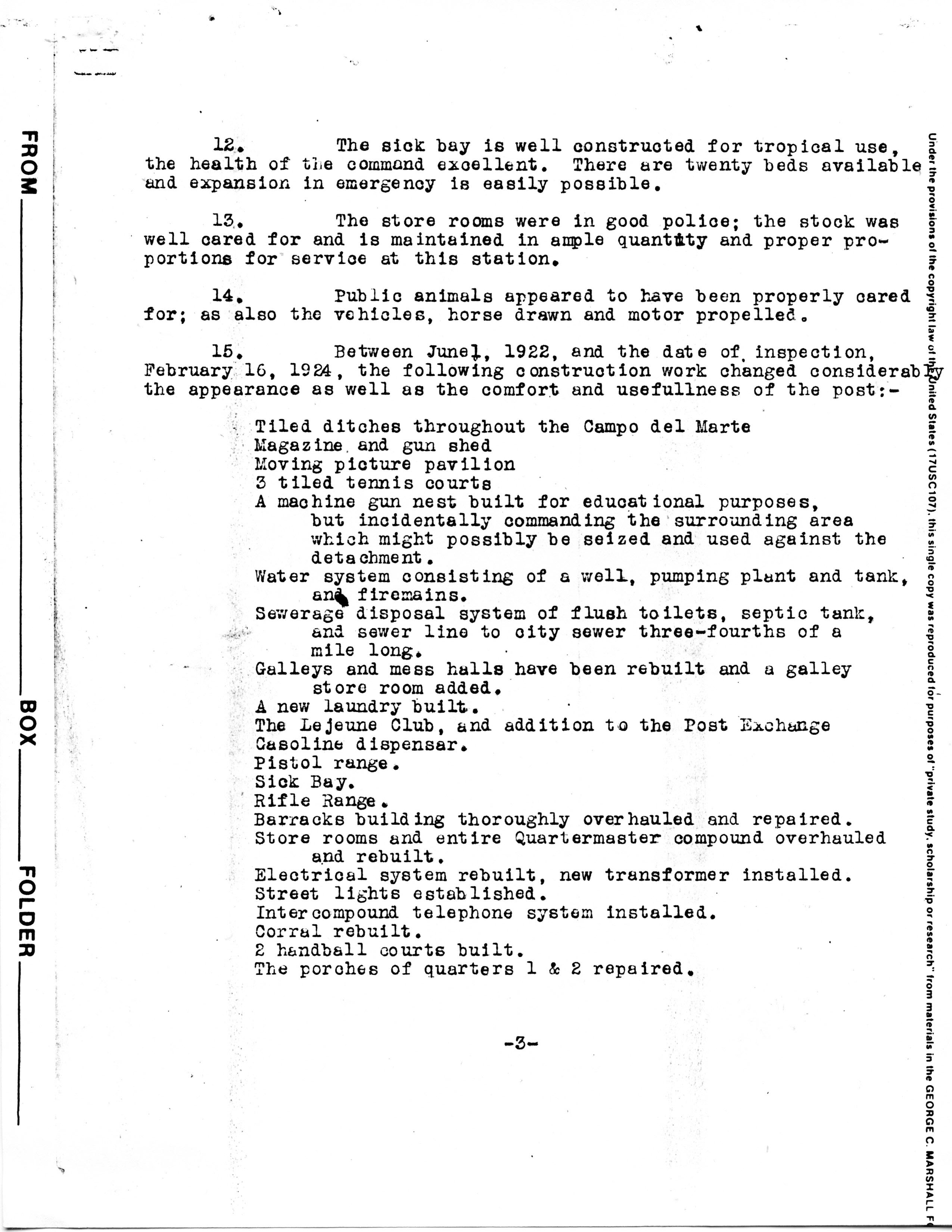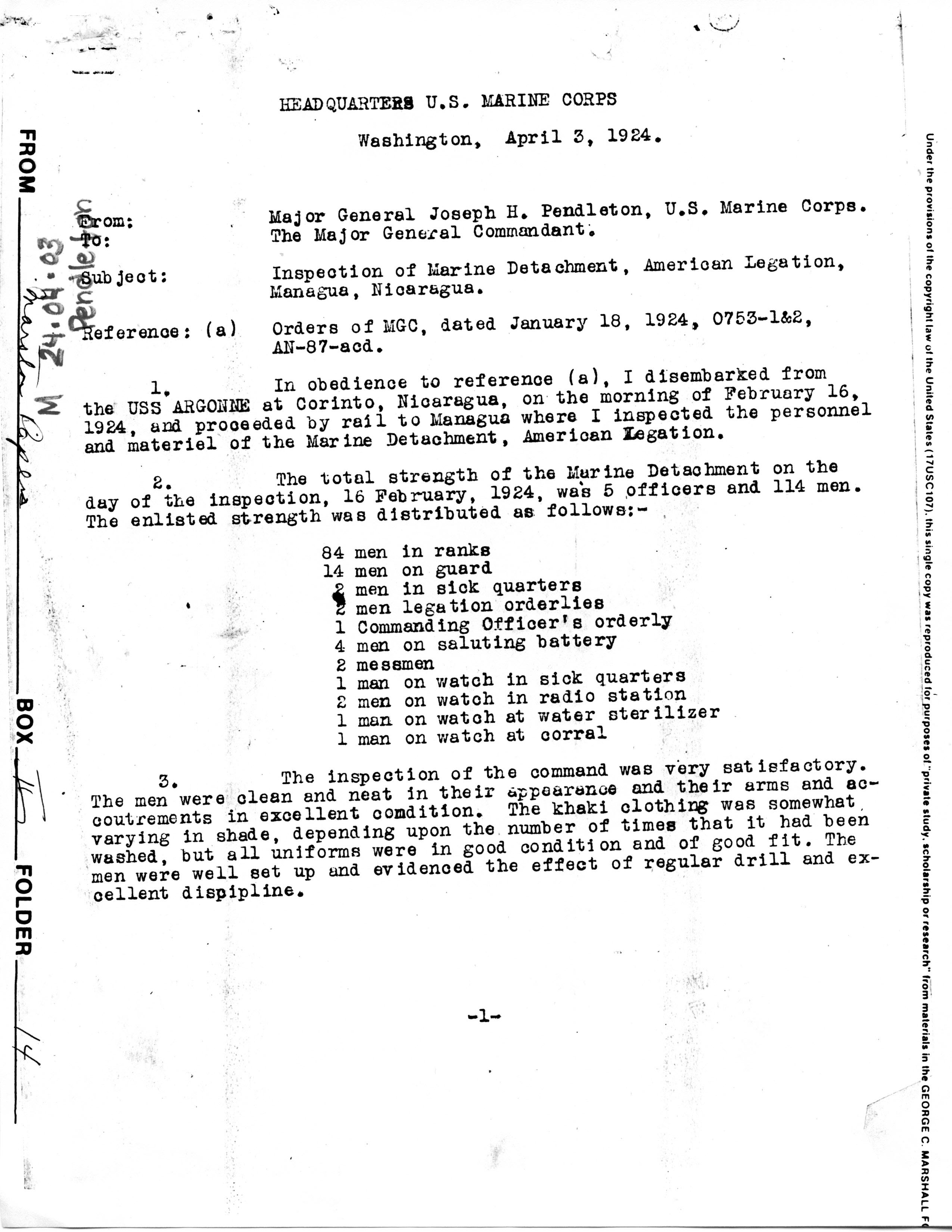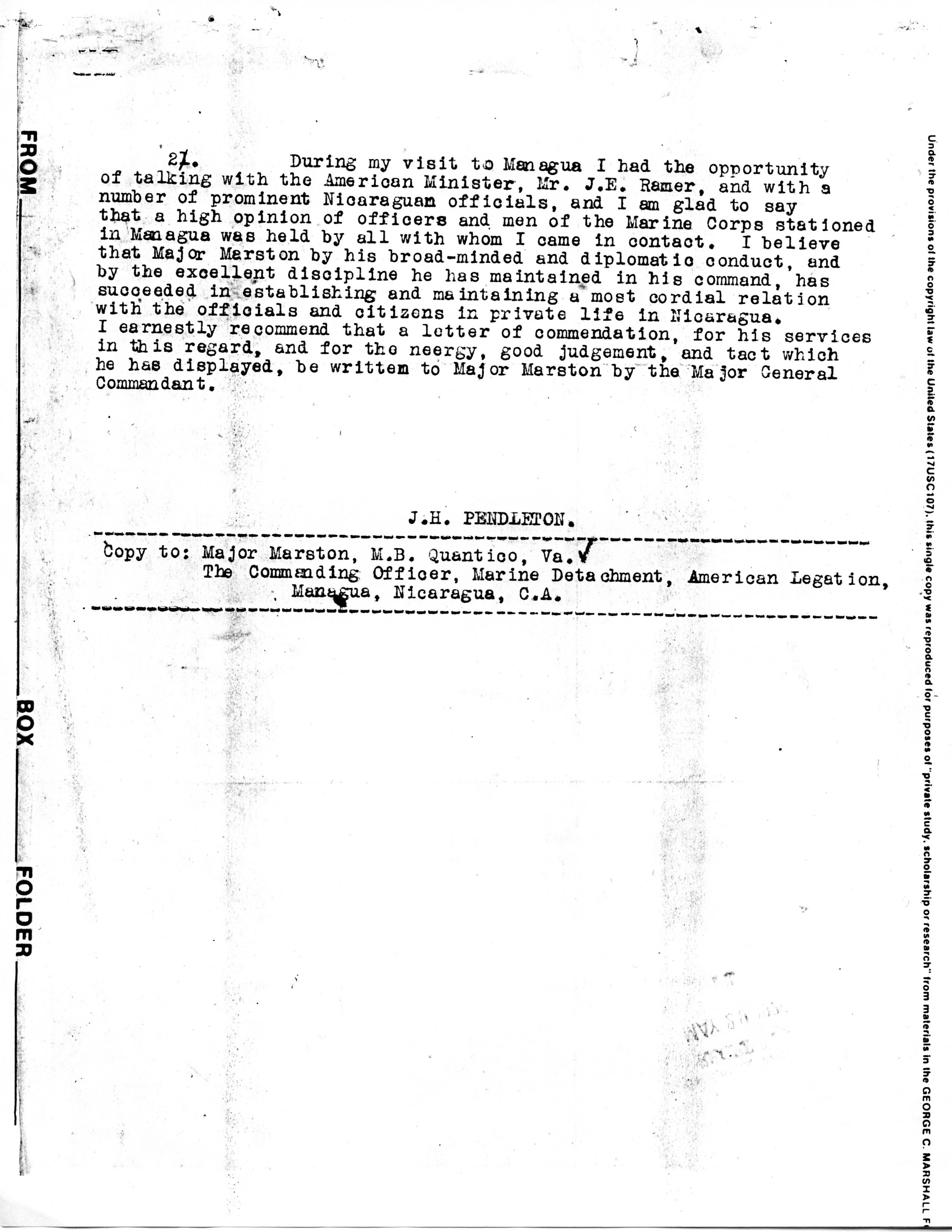 Copy to: Major Marston, M.B. Quantico, Va. ¶ The