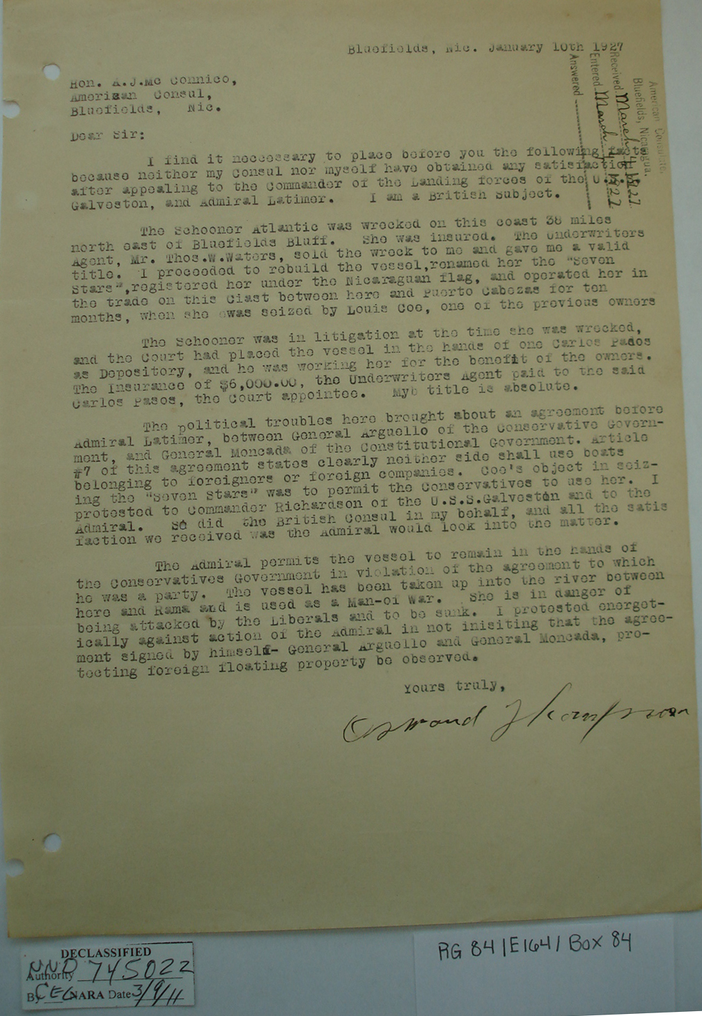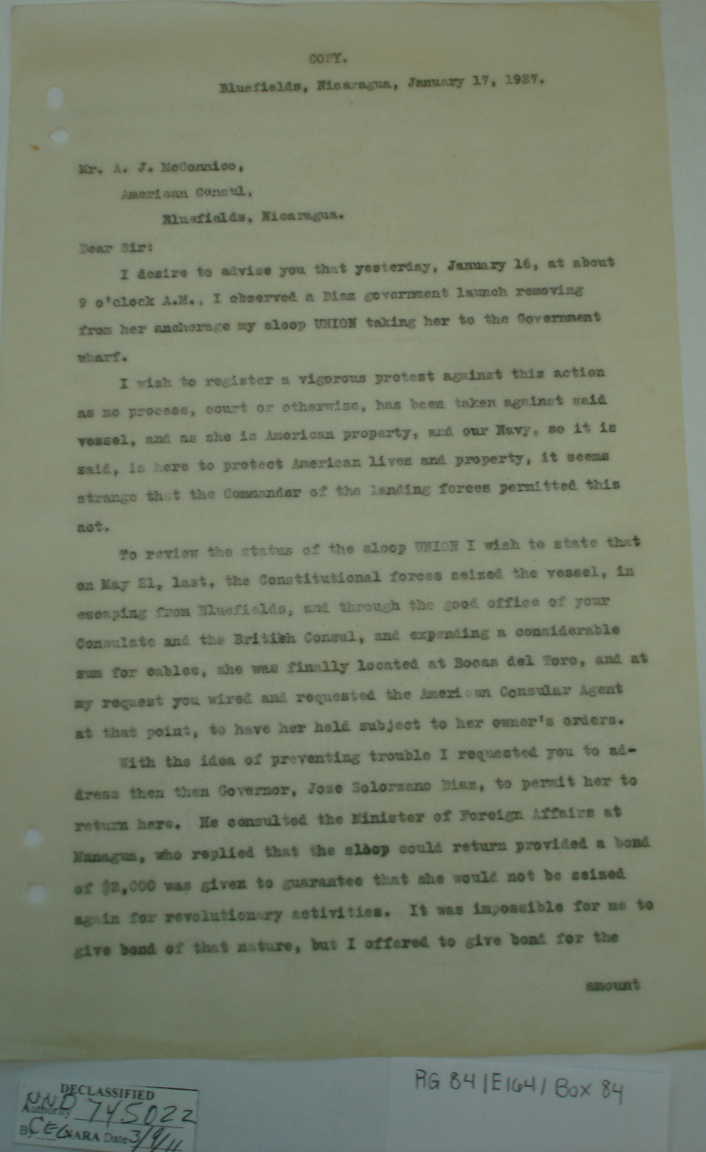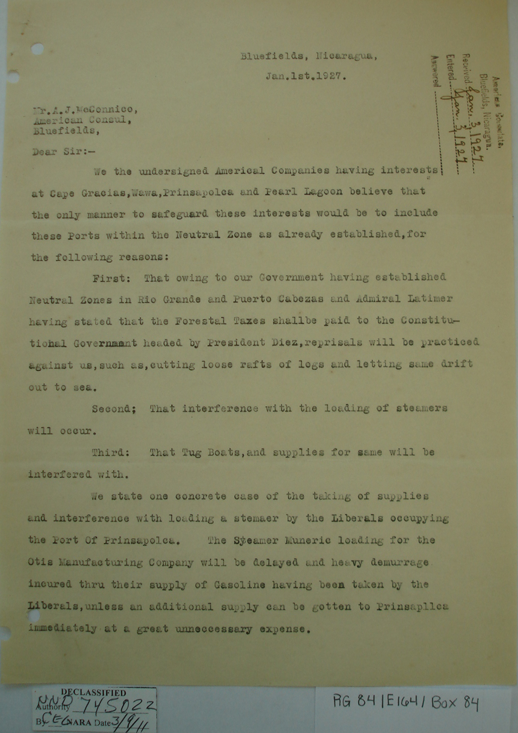 Consul, Bluefields, p. 1. "Bluefields,