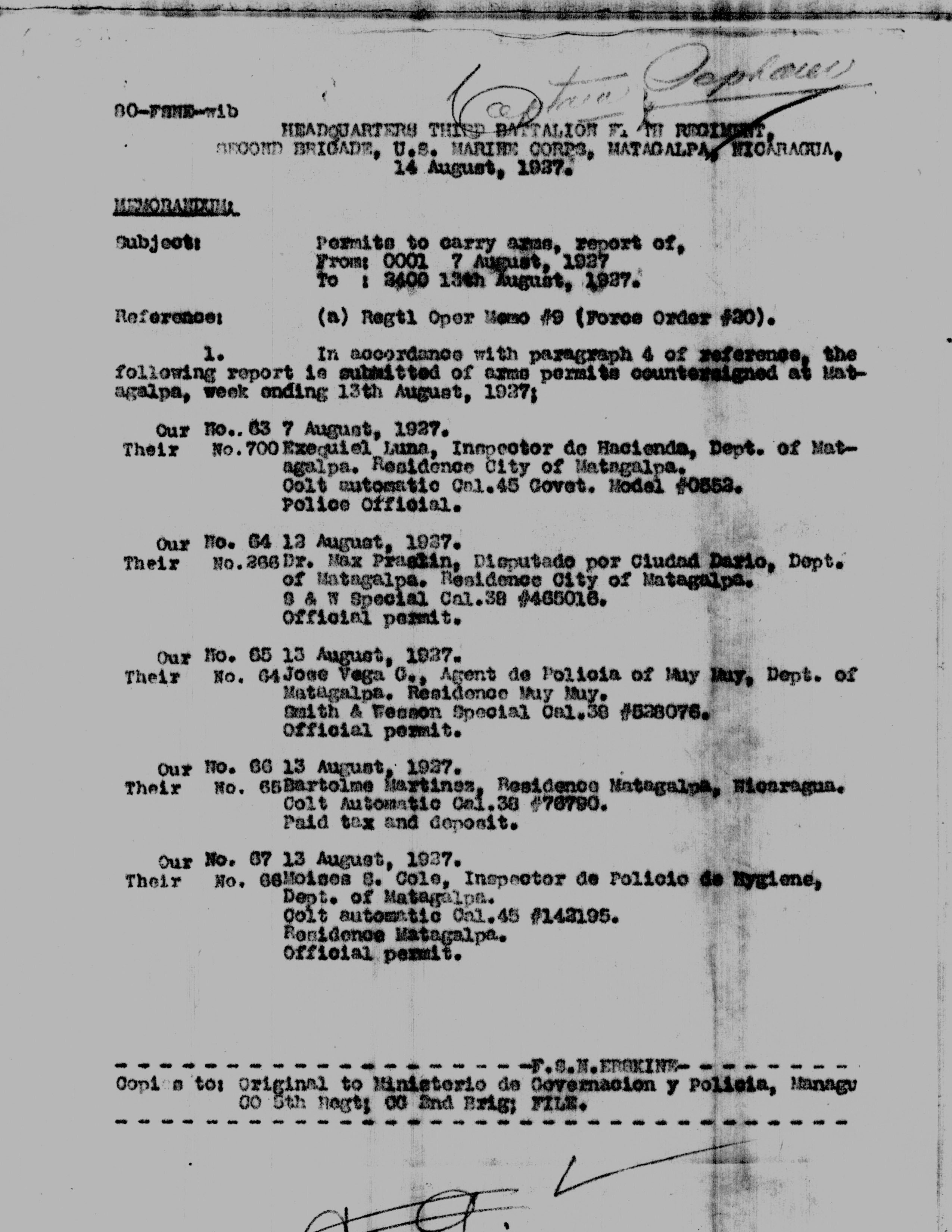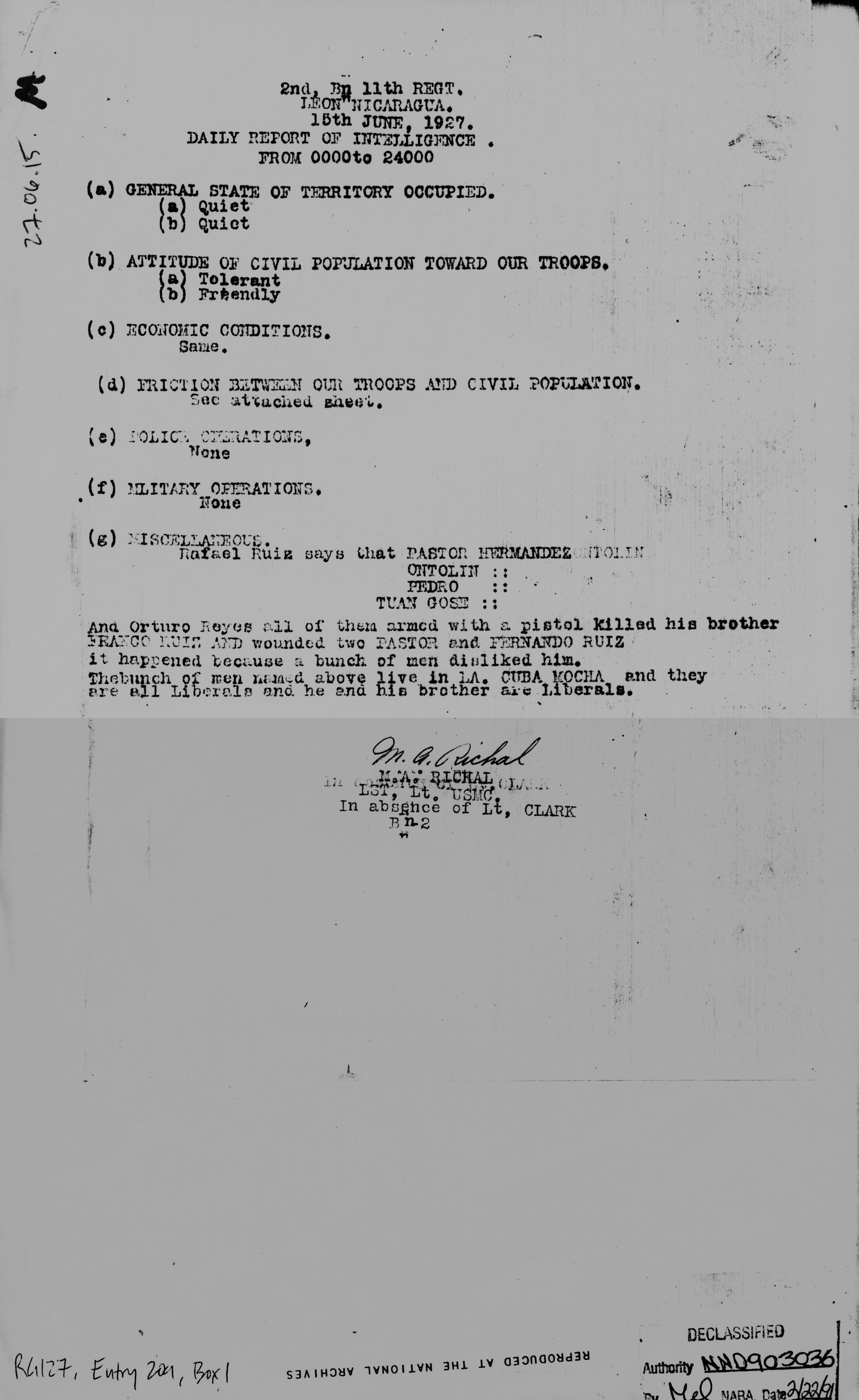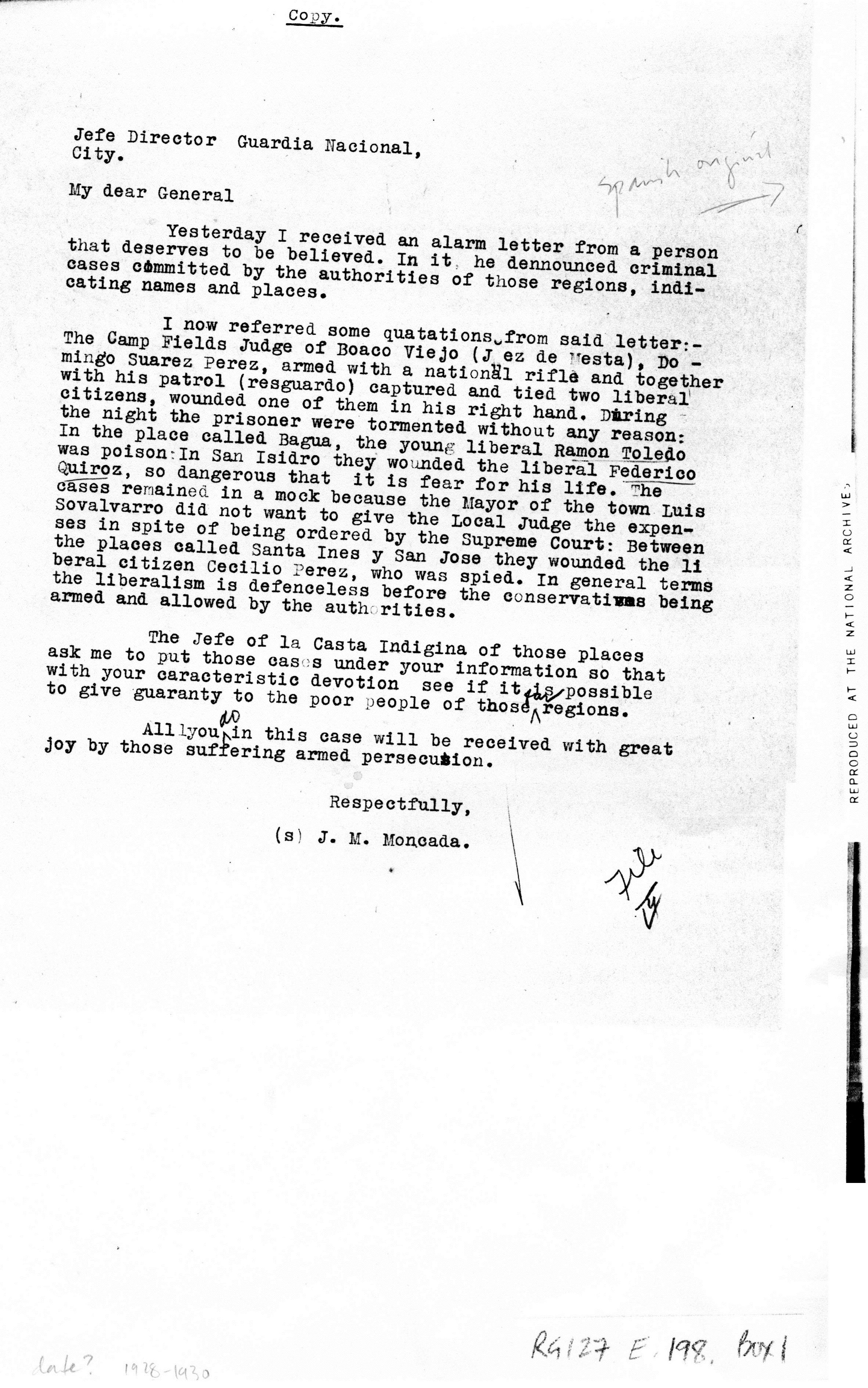 Moncada, Managua, to Jefe Director, Guardia