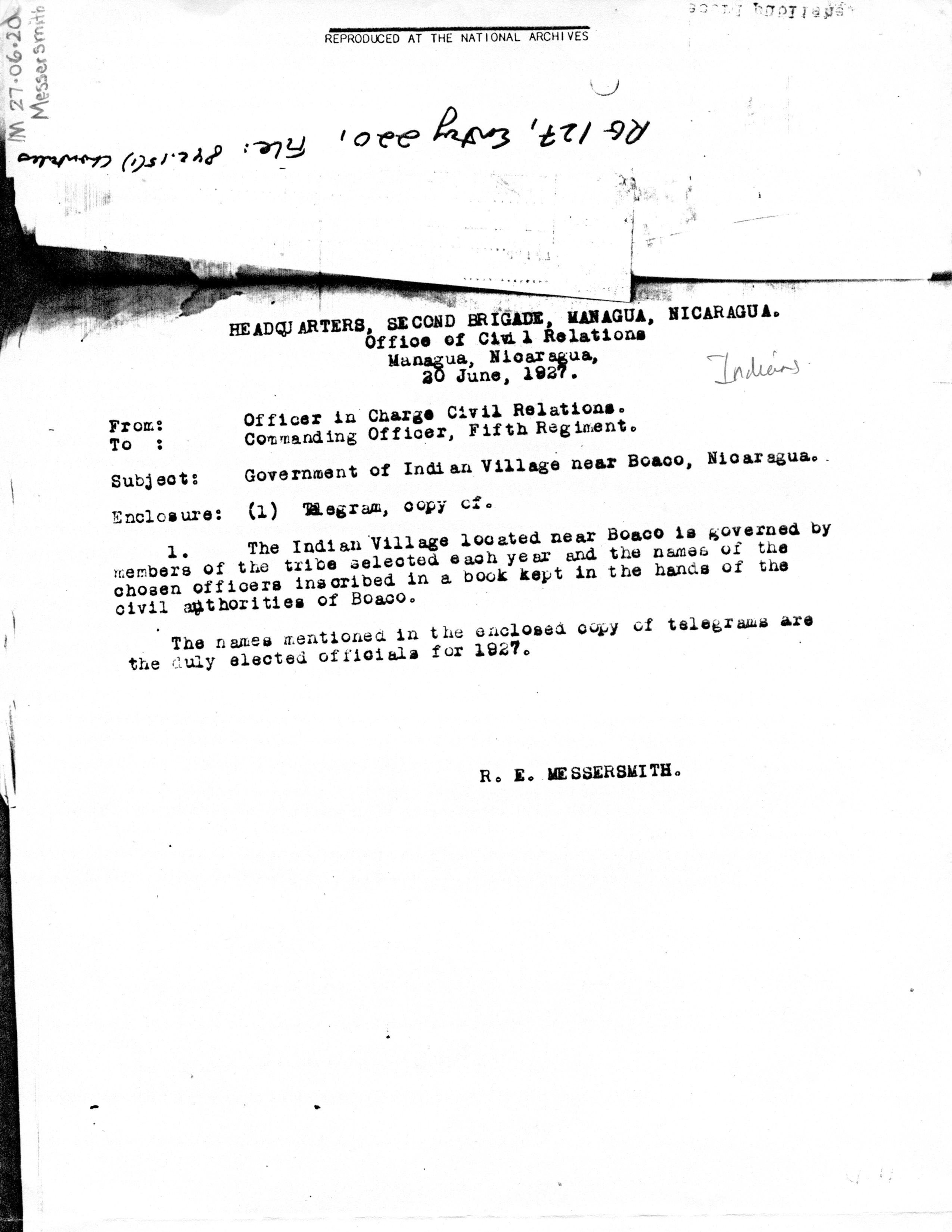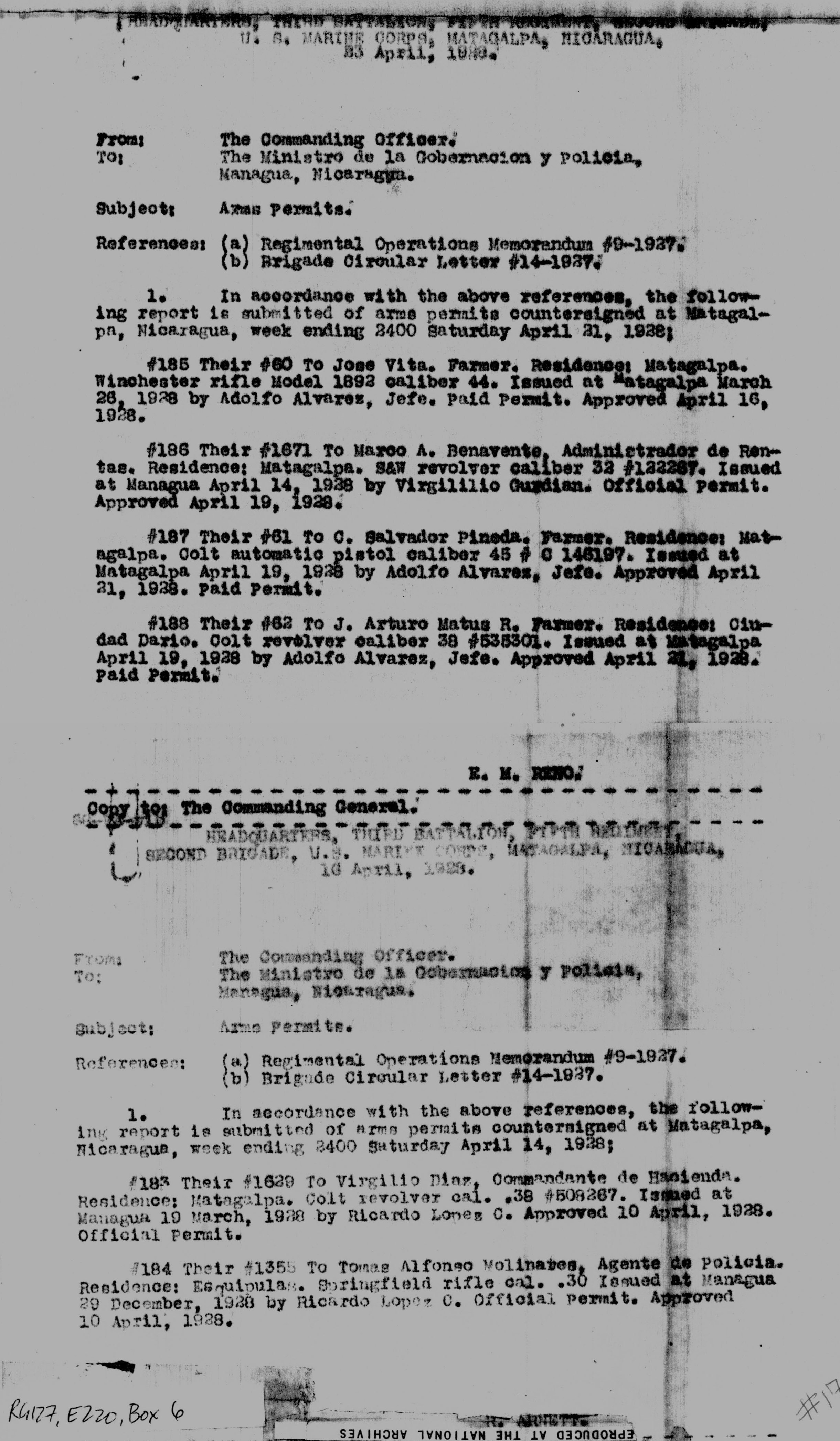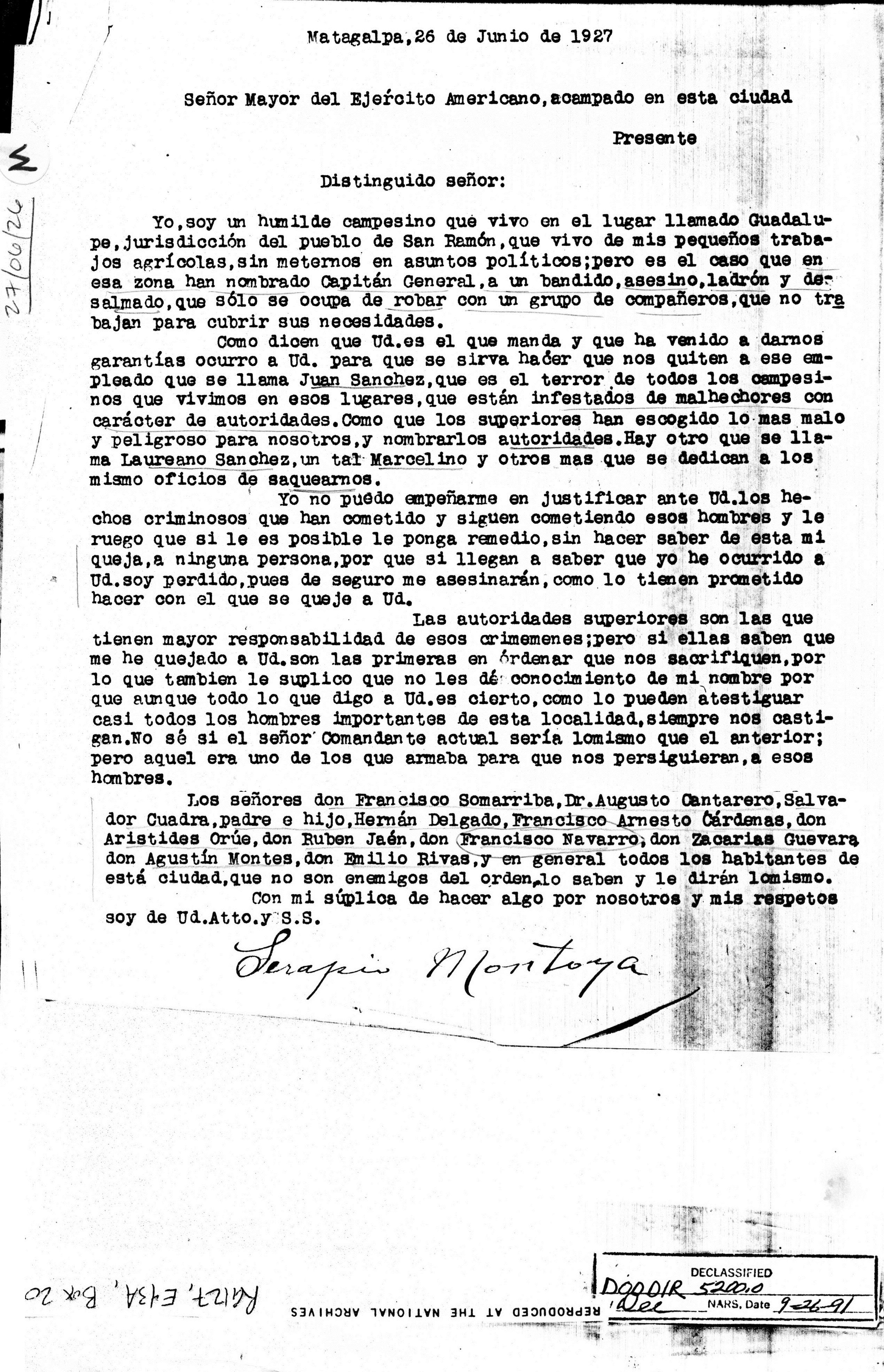 Montoya, Matagalpa, to Señor Mayor del Ejército
