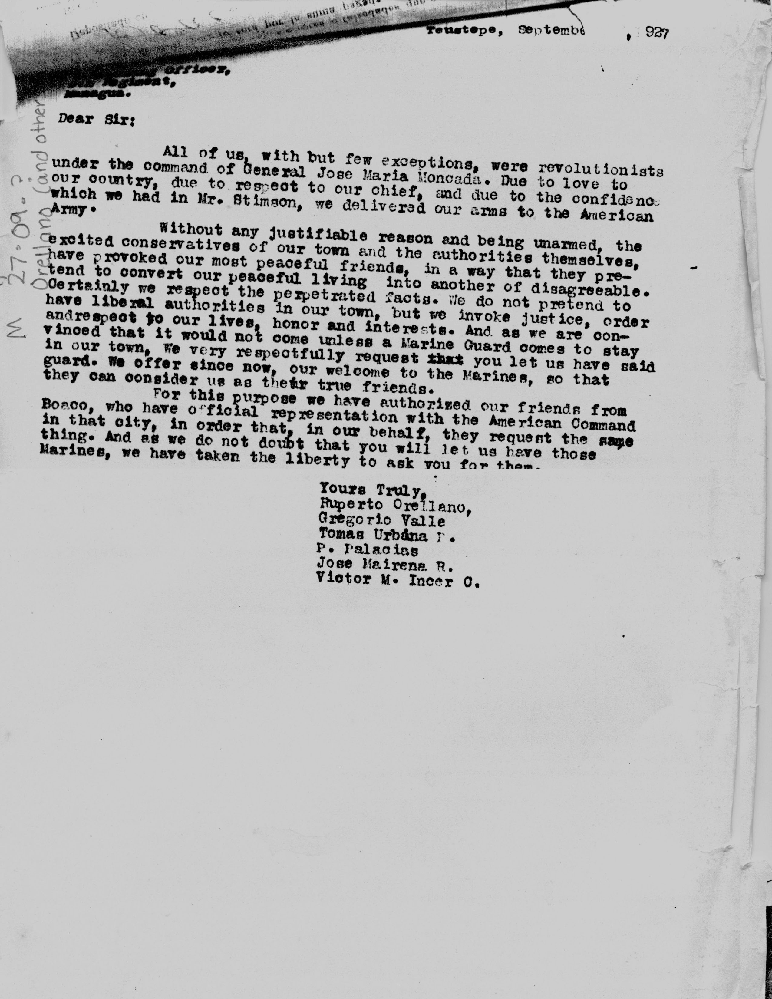 Regiment, ¶ Managua. ¶ Dear Sir: ¶ All of us,