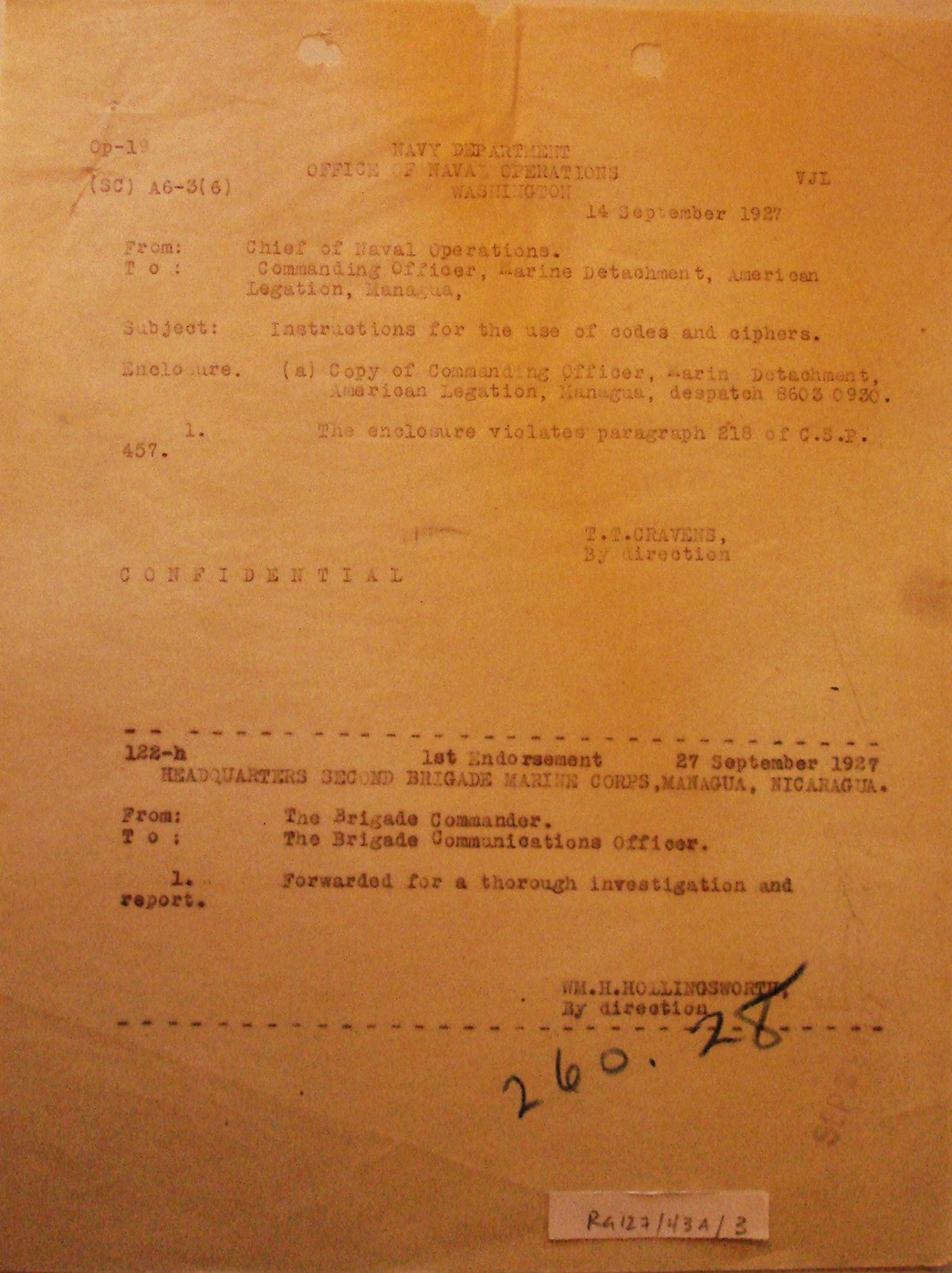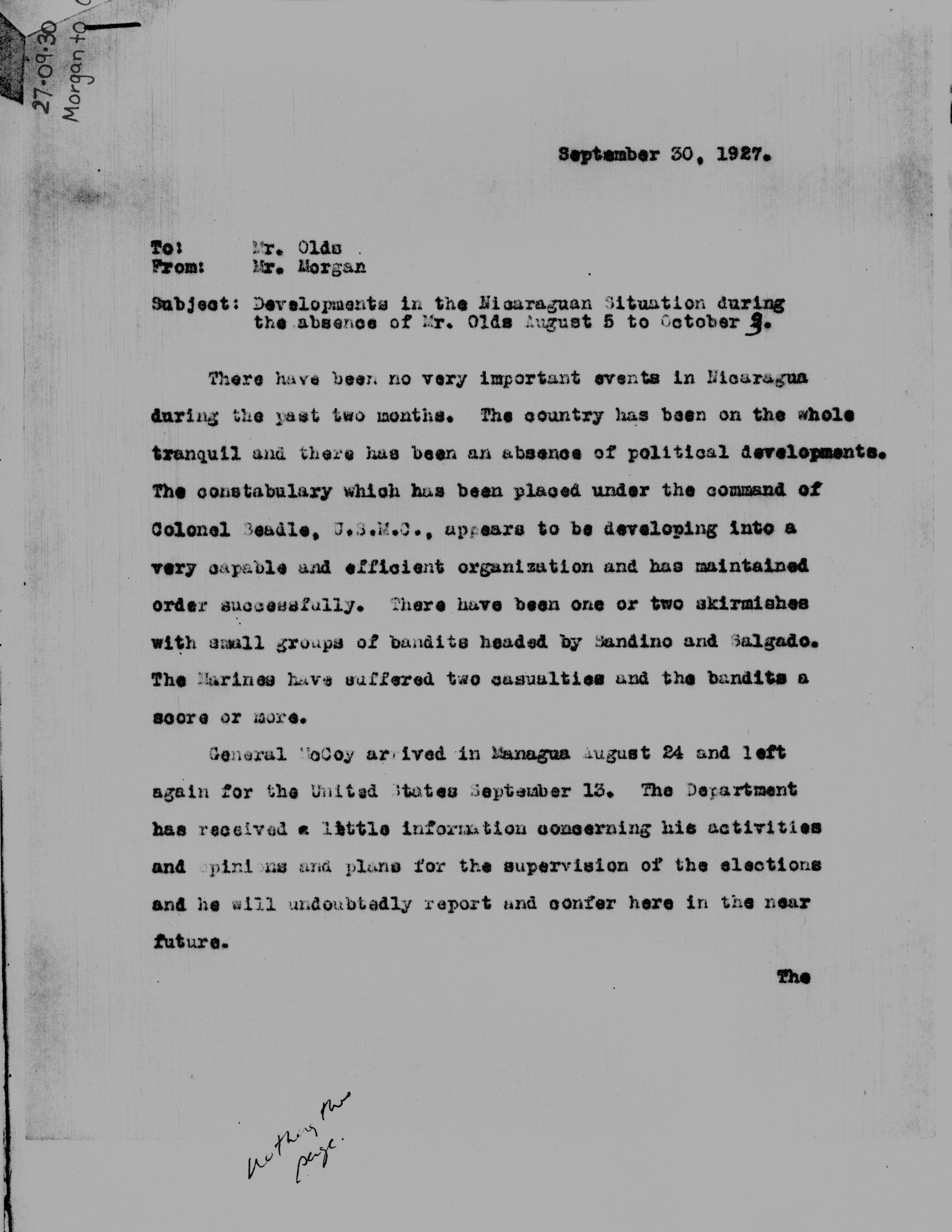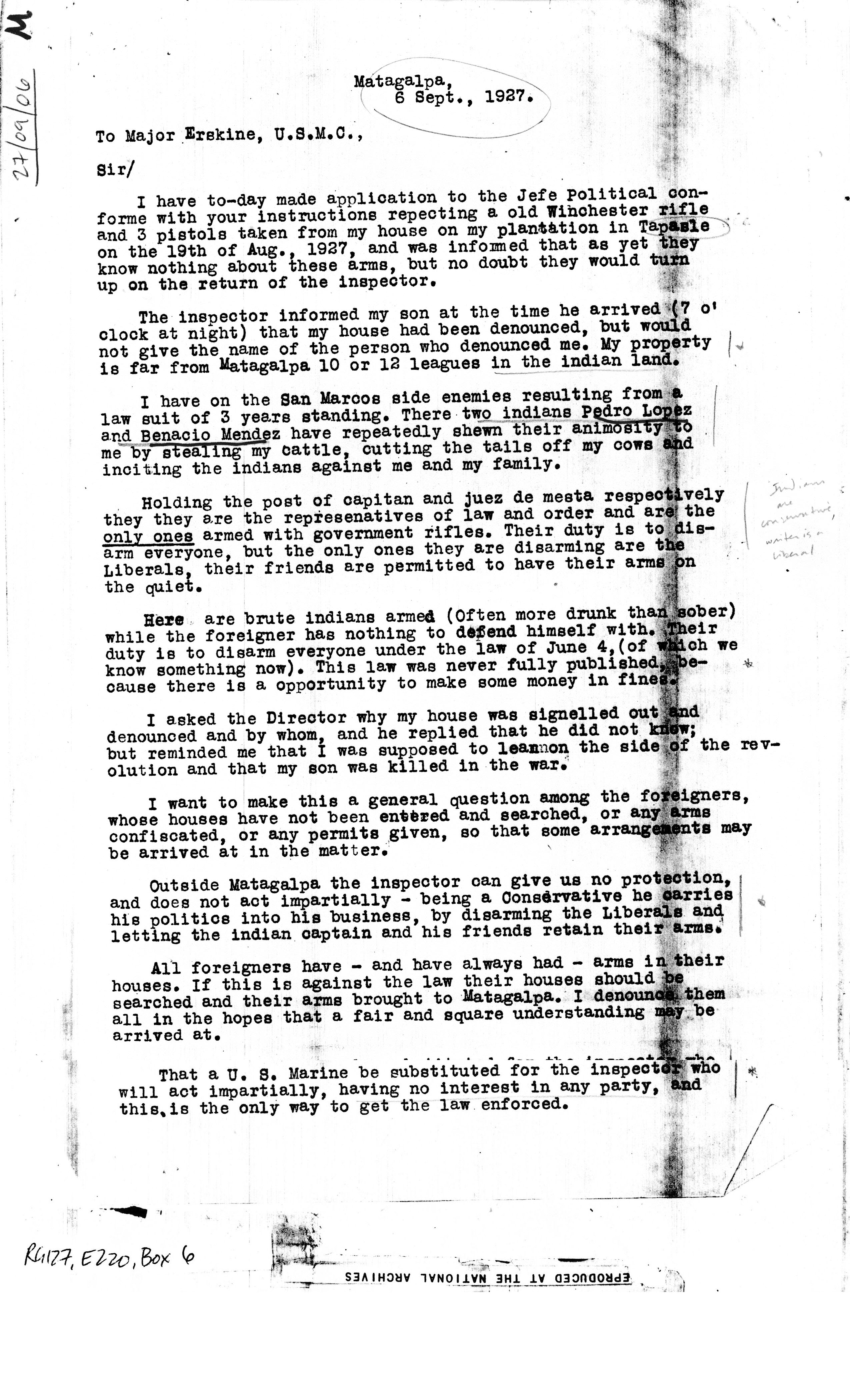 6 Sept., 1927. ¶ To Major Erskine, U.S.M.C., ¶
