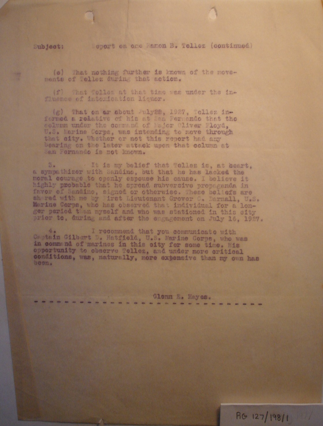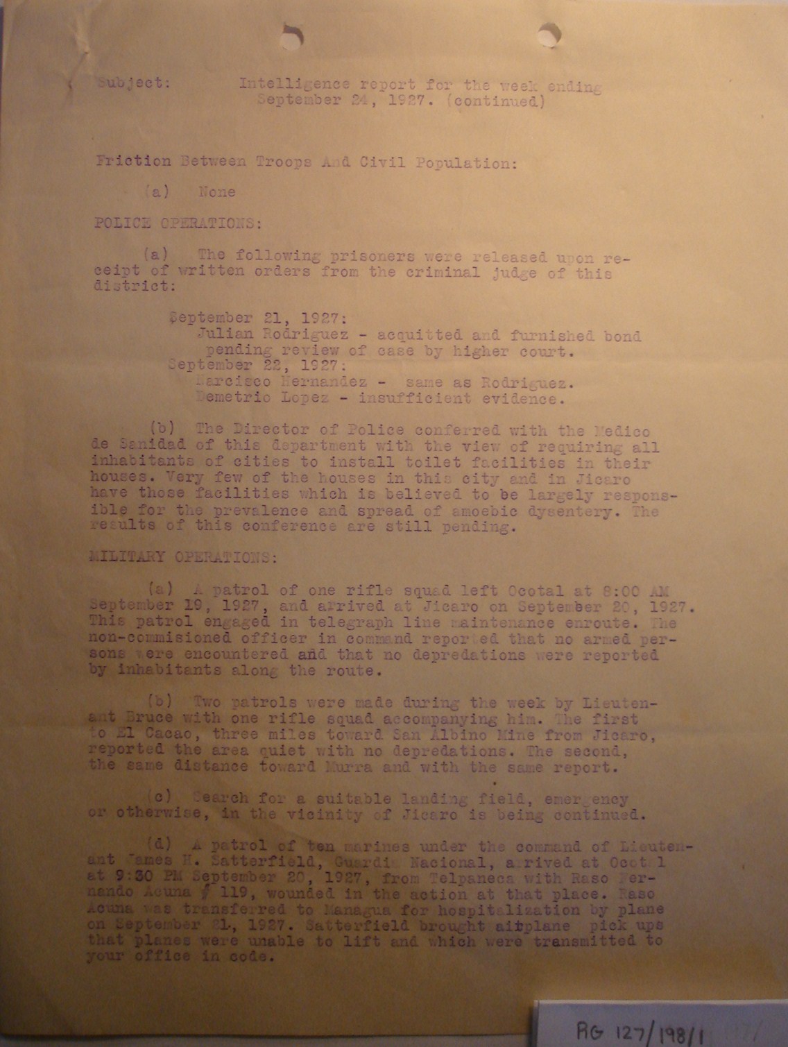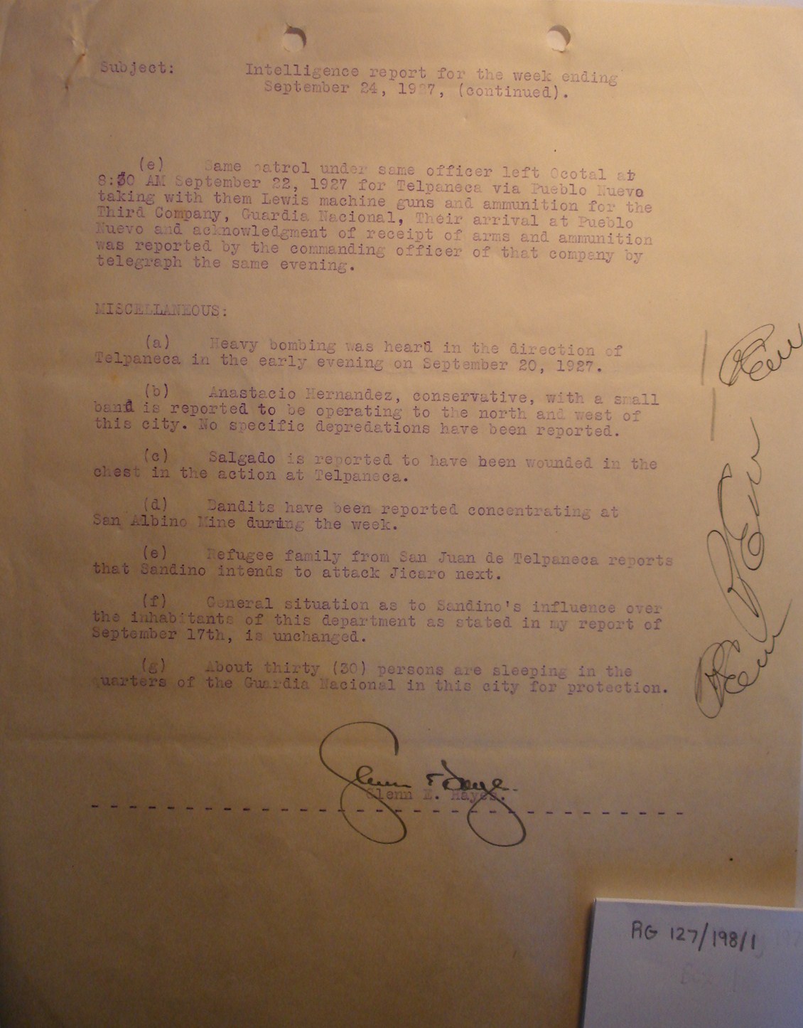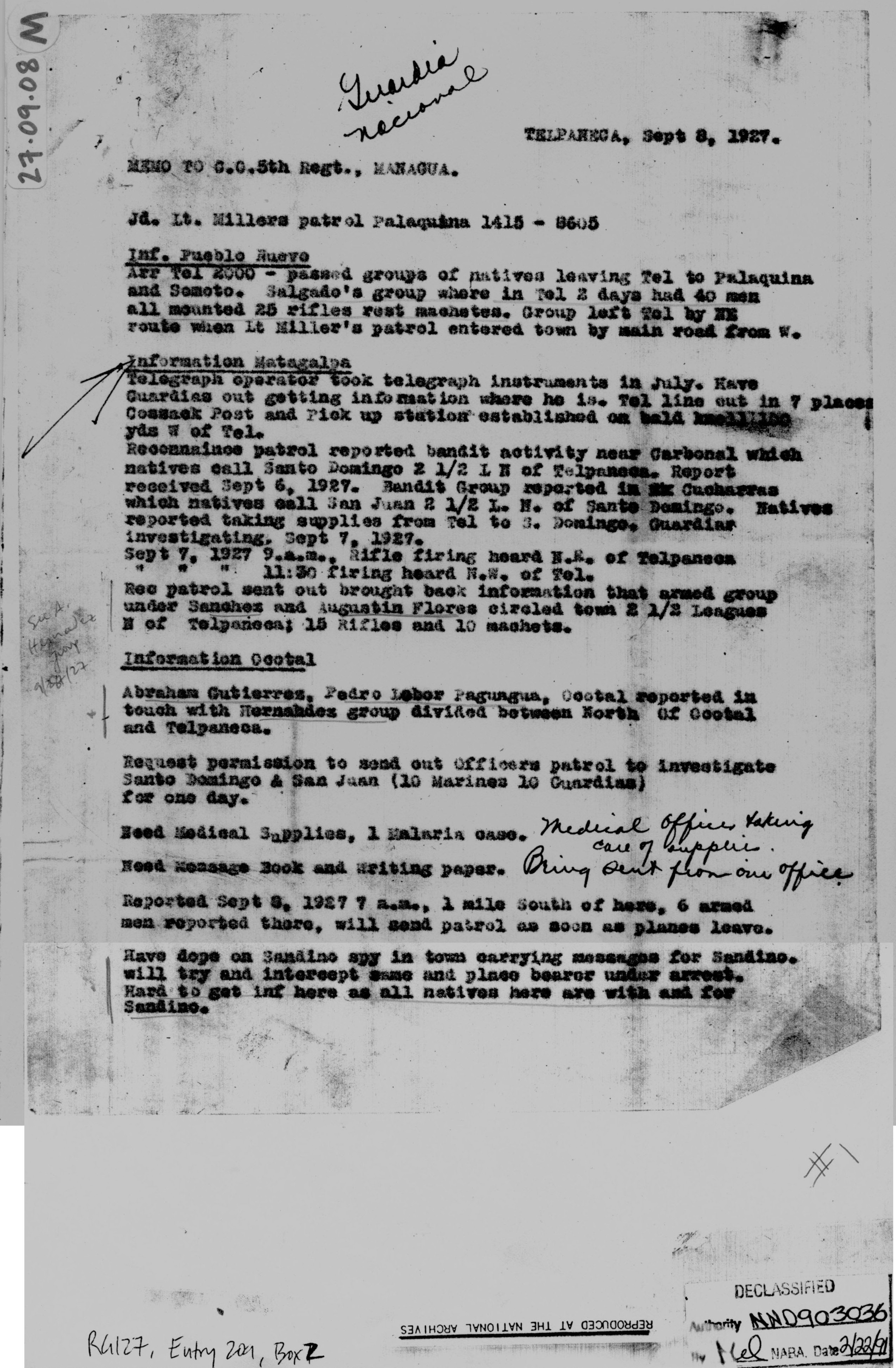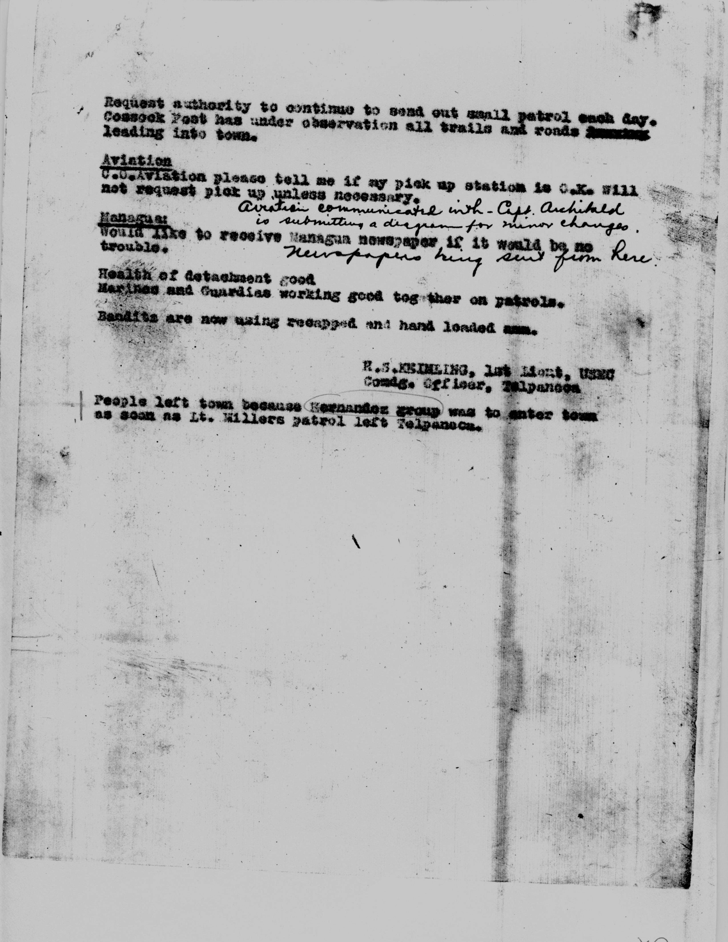 Fred W. Fley, Matagalpa, to Major Erskine, USMC,