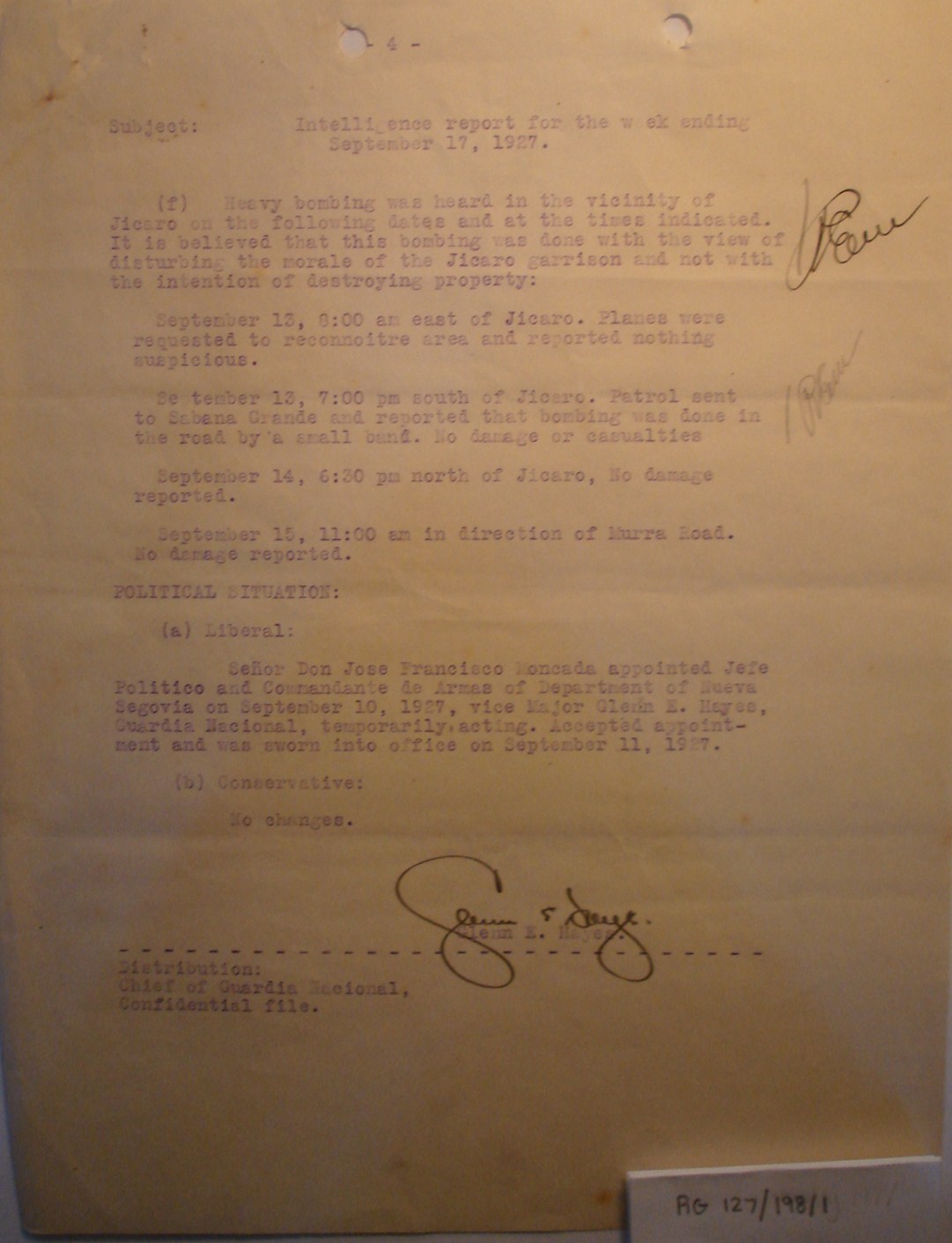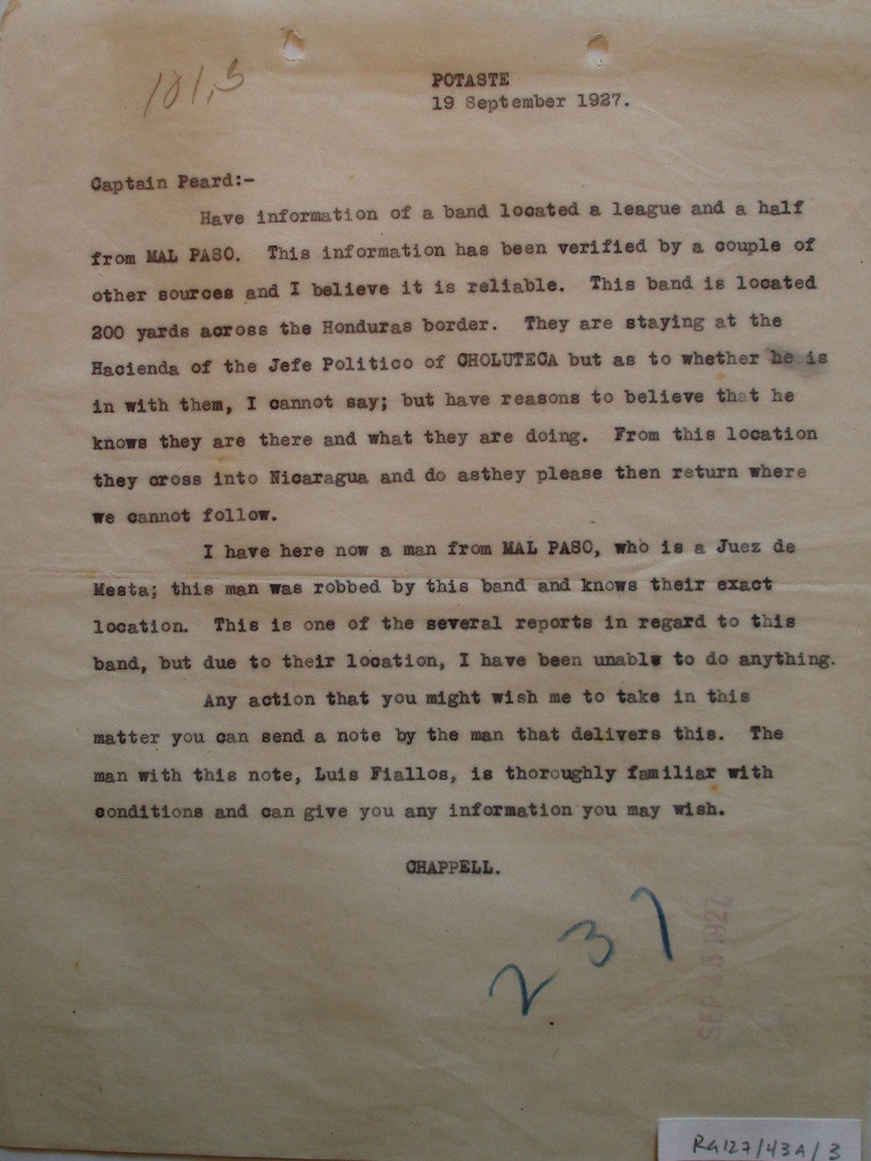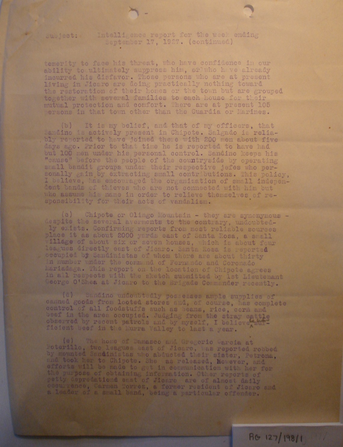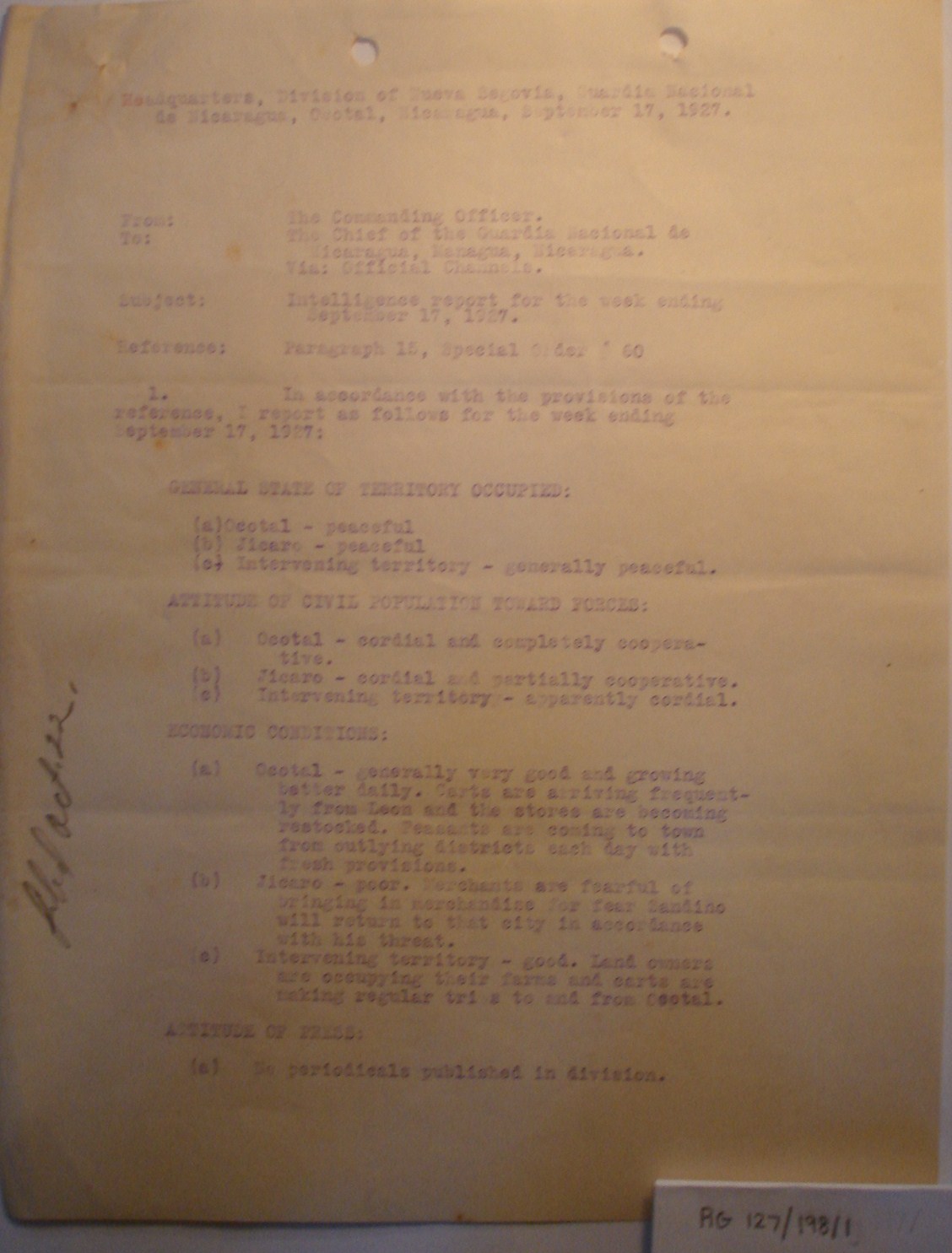 Fred W. Fley, Matagalpa, to Major Erskine, USMC,