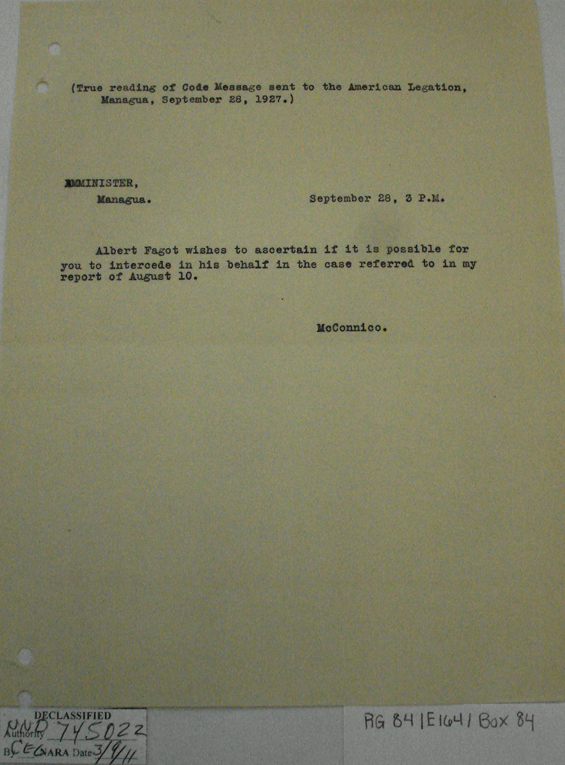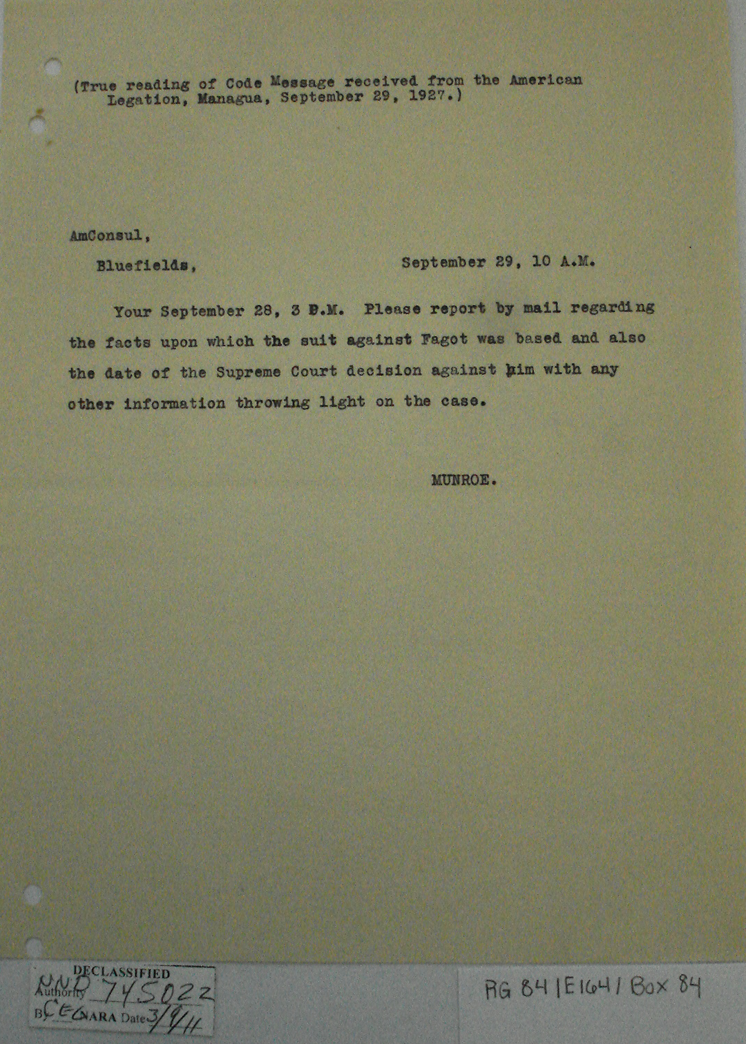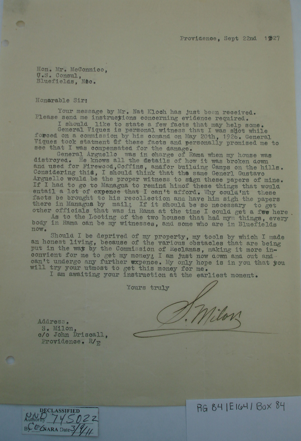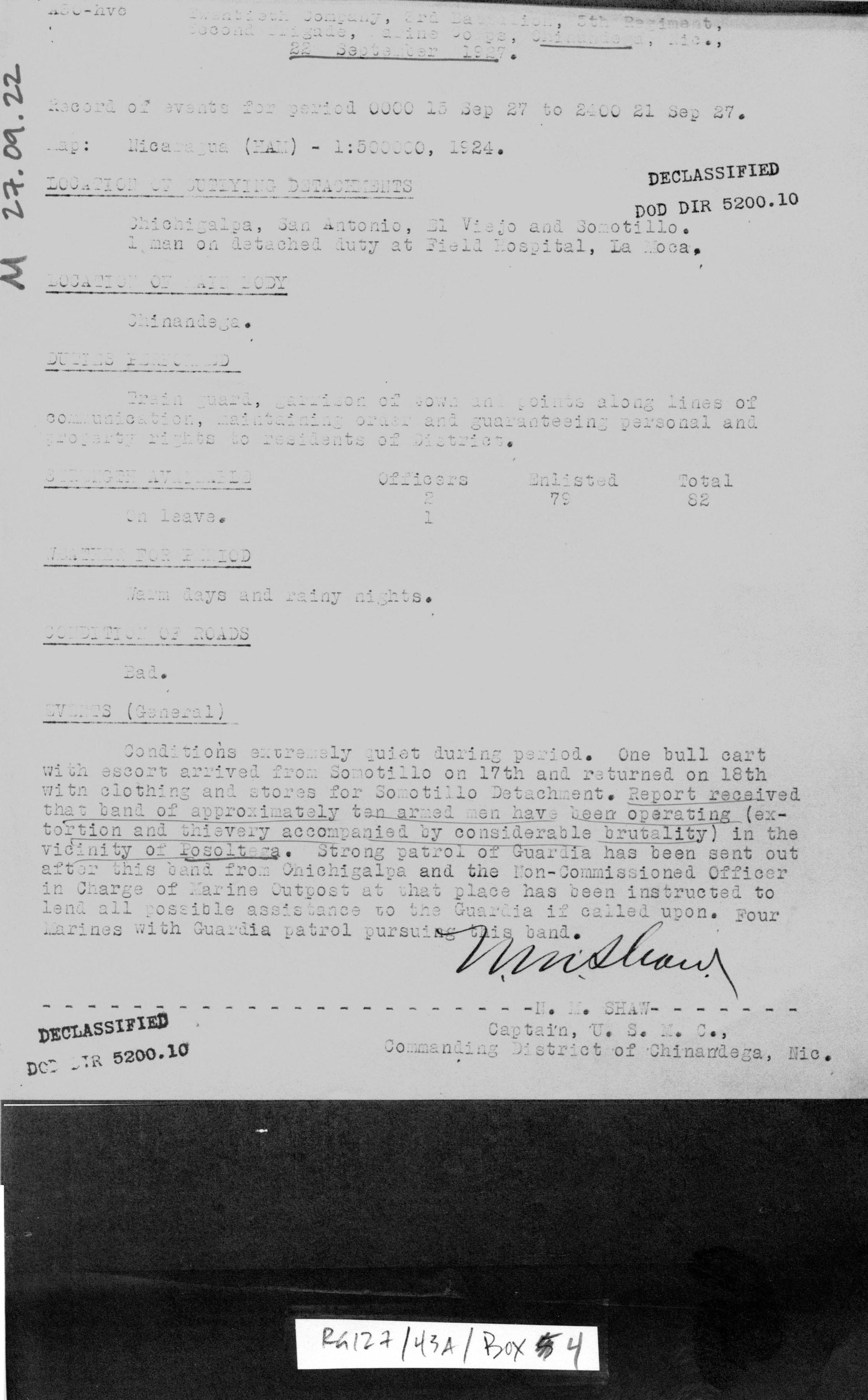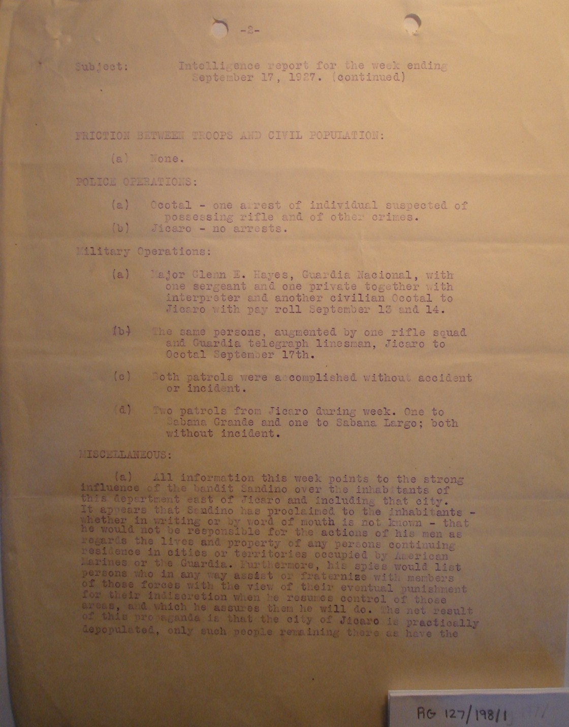 Fred W. Fley, Matagalpa, to Major Erskine, USMC,