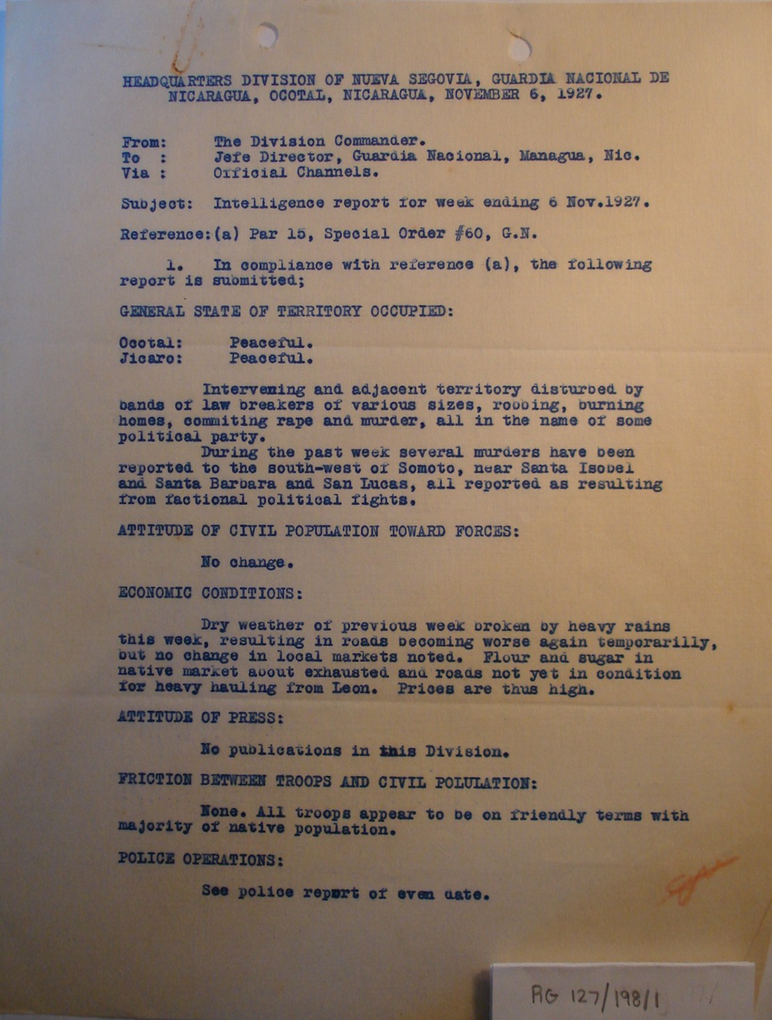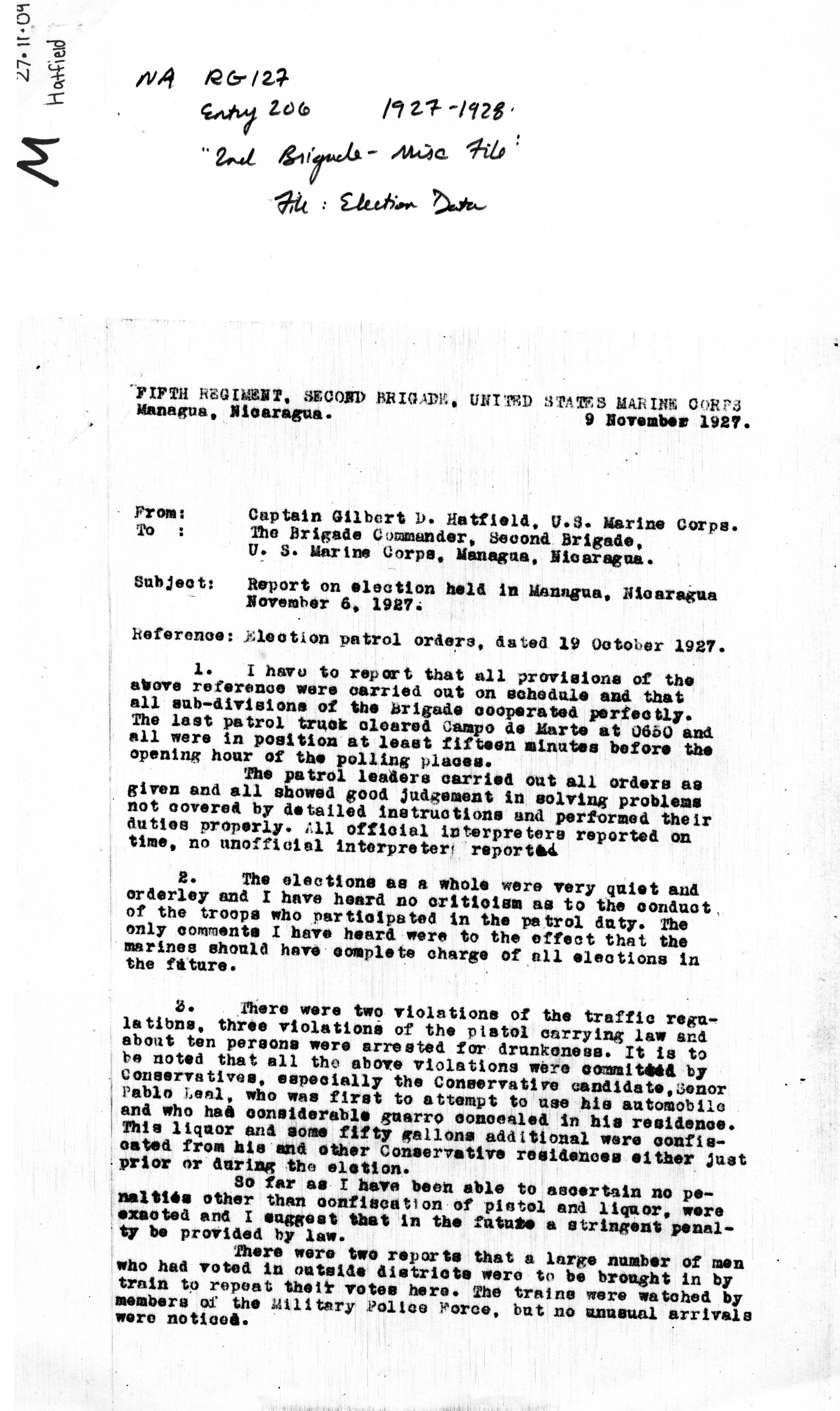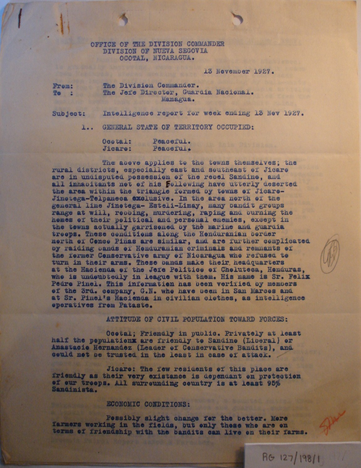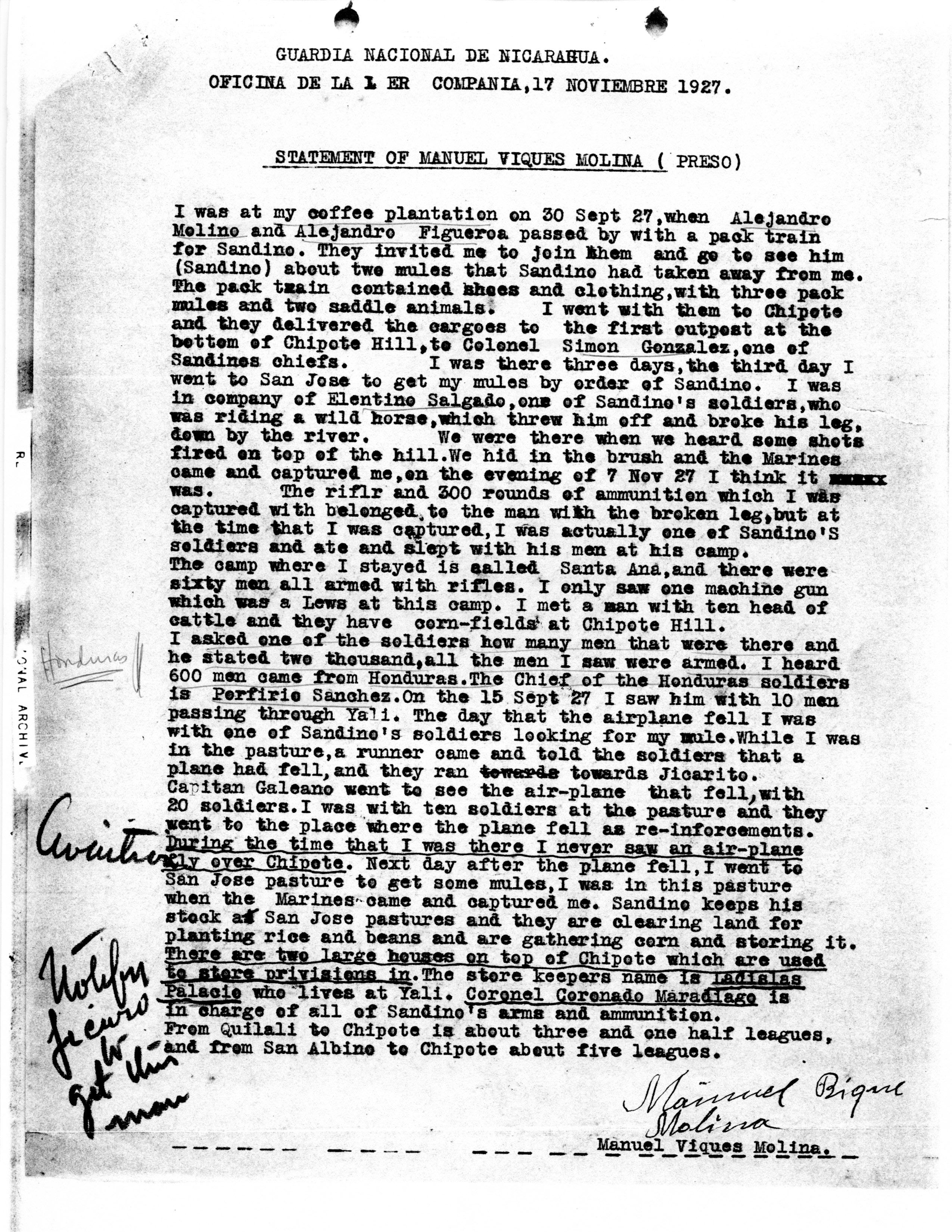NUEVA SEGOVIA, NICARAGUA. ¶ 27 NOVEMBER 1927. ¶