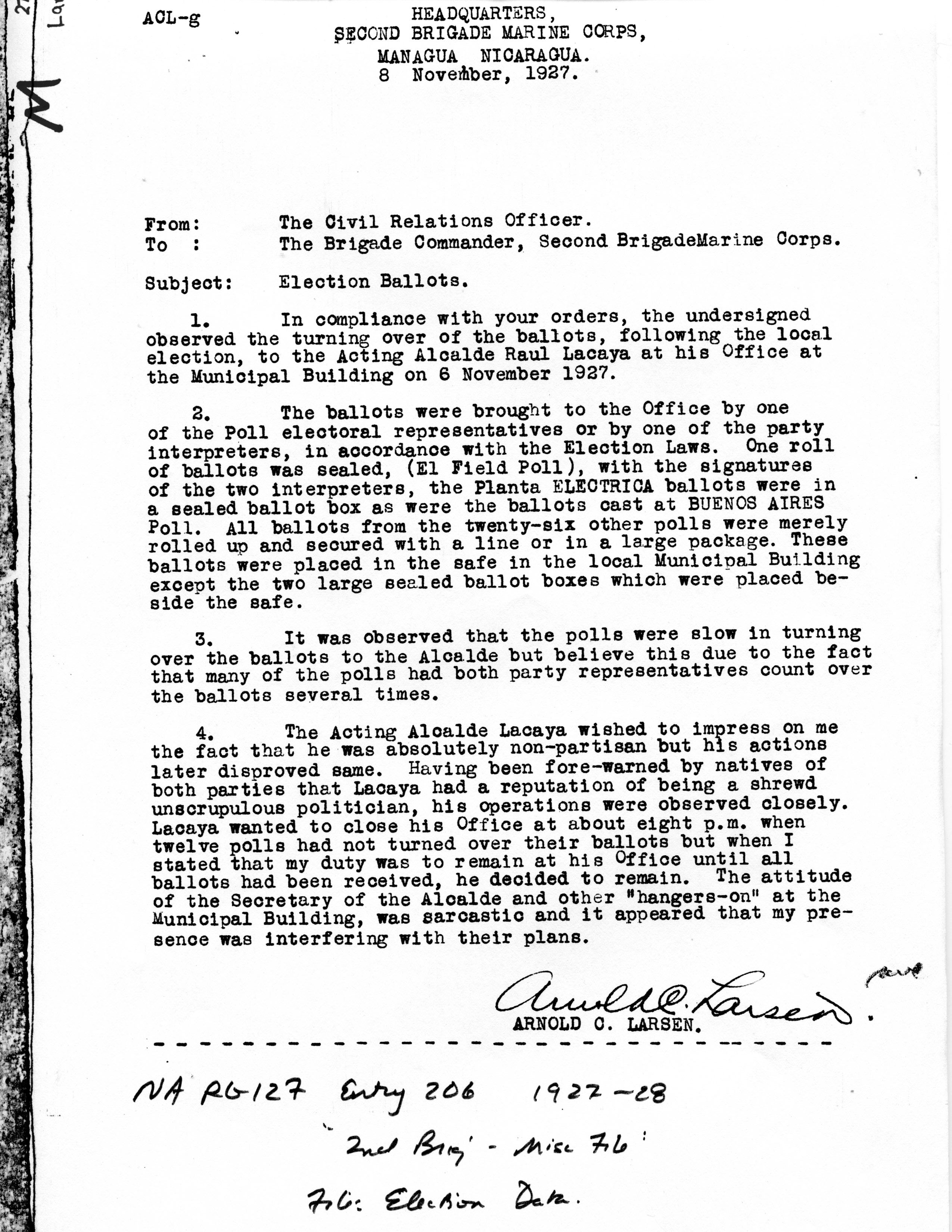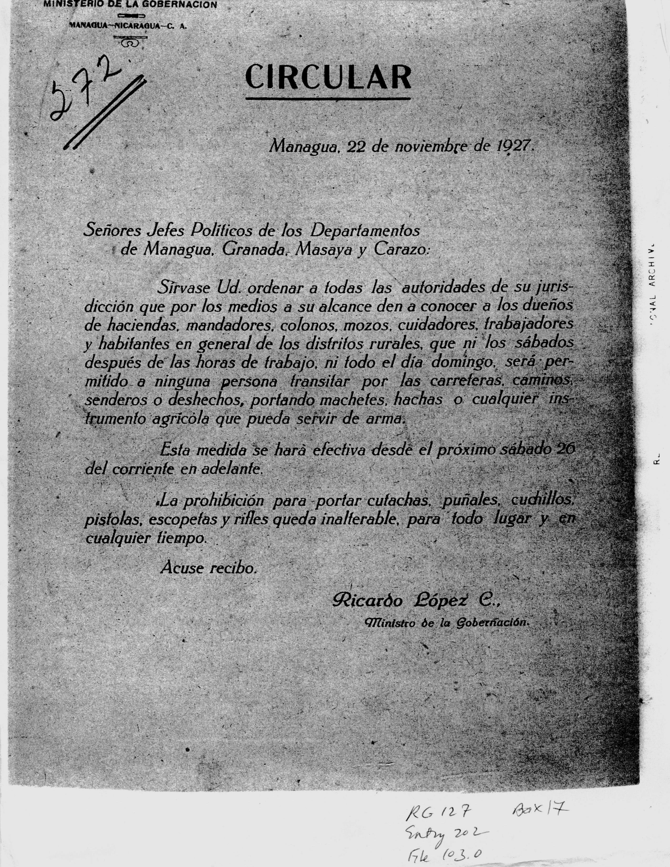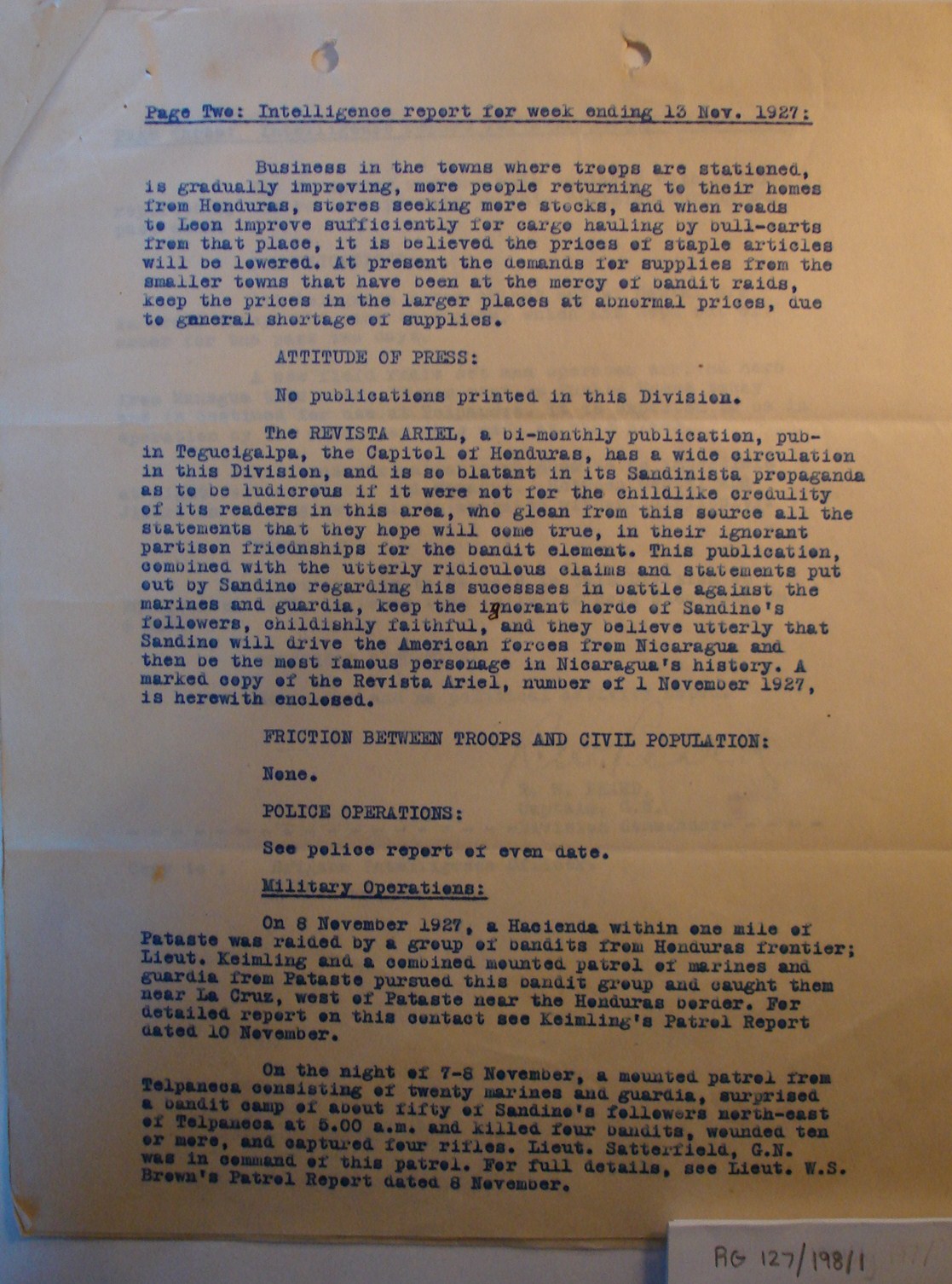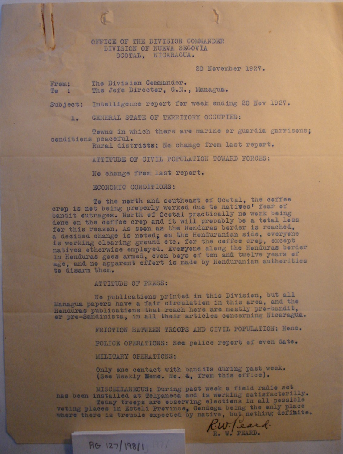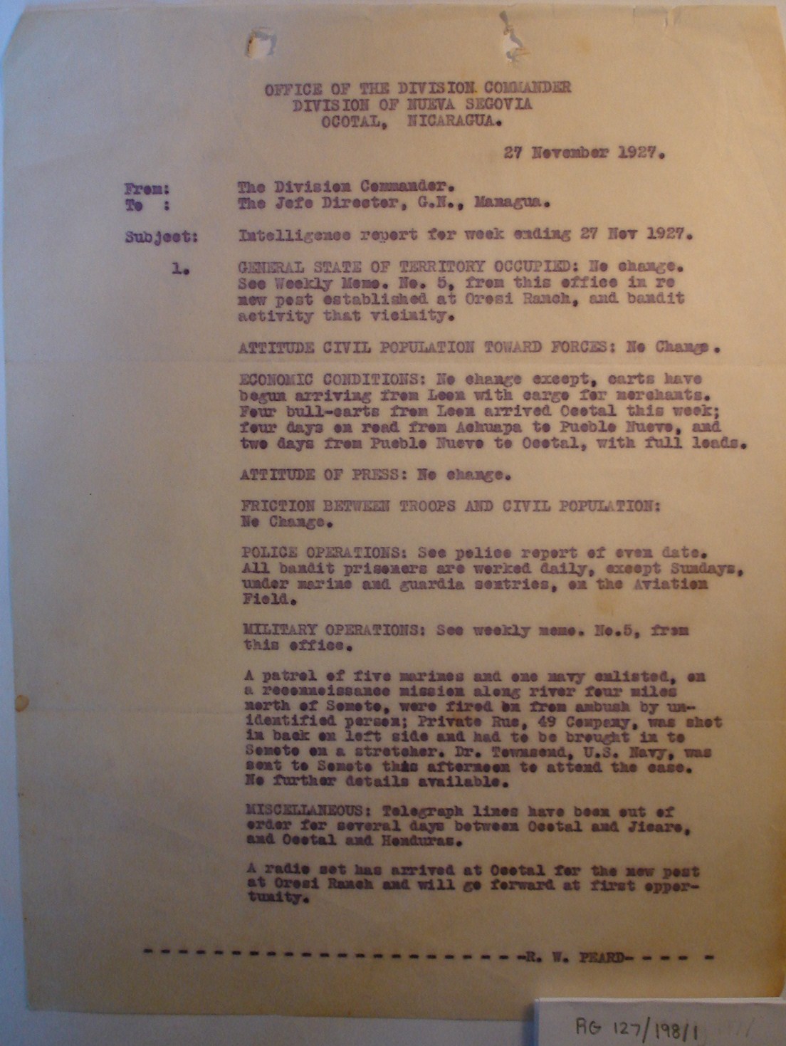 NUEVA SEGOVIA, NICARAGUA. ¶ 27 NOVEMBER 1927. ¶