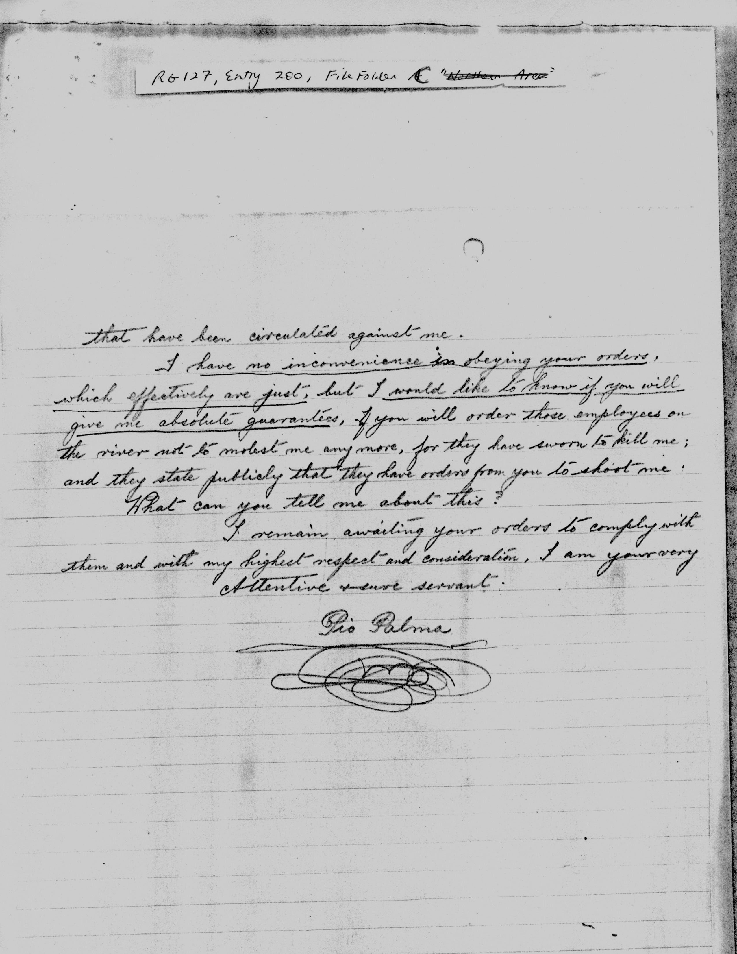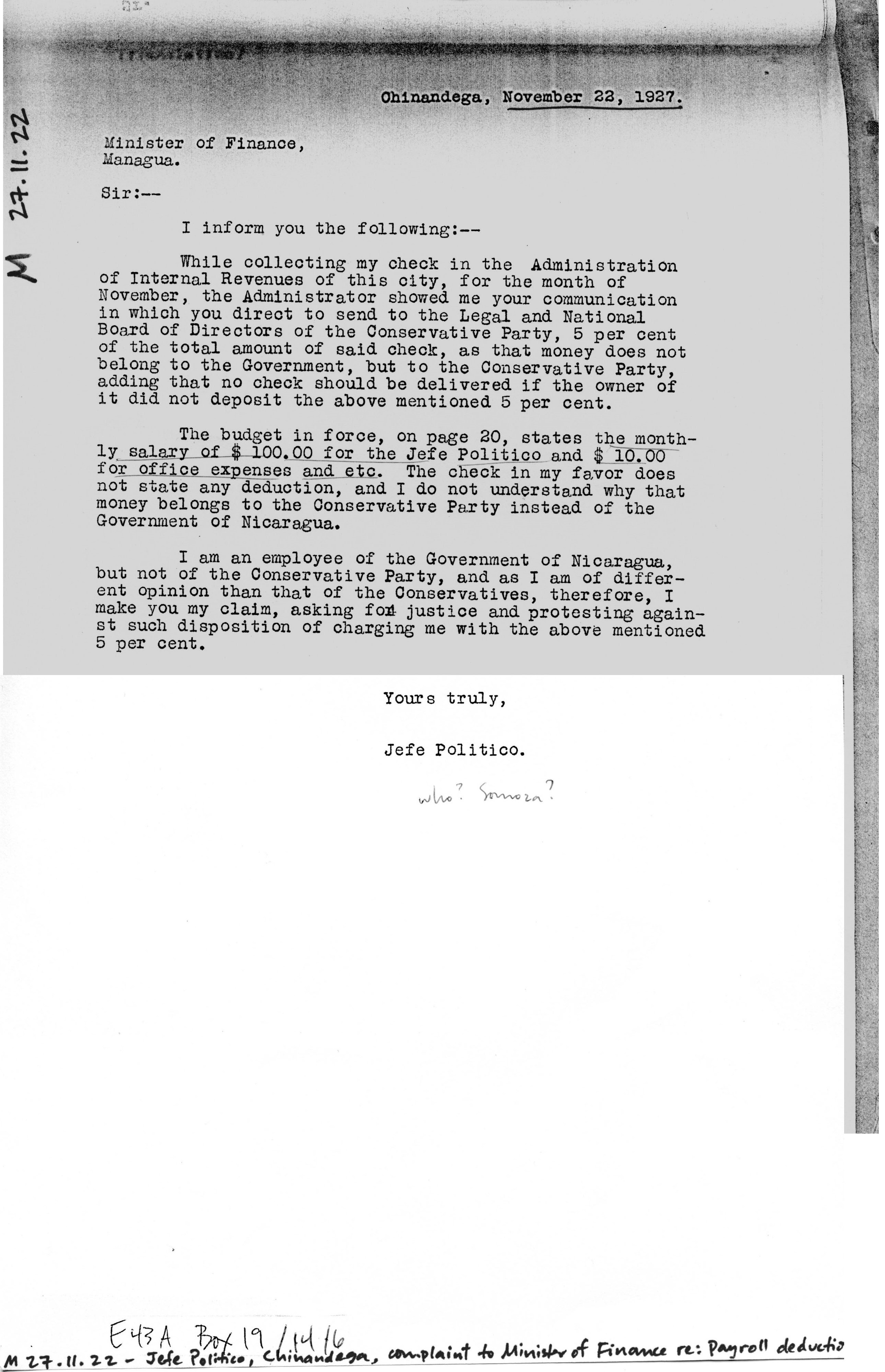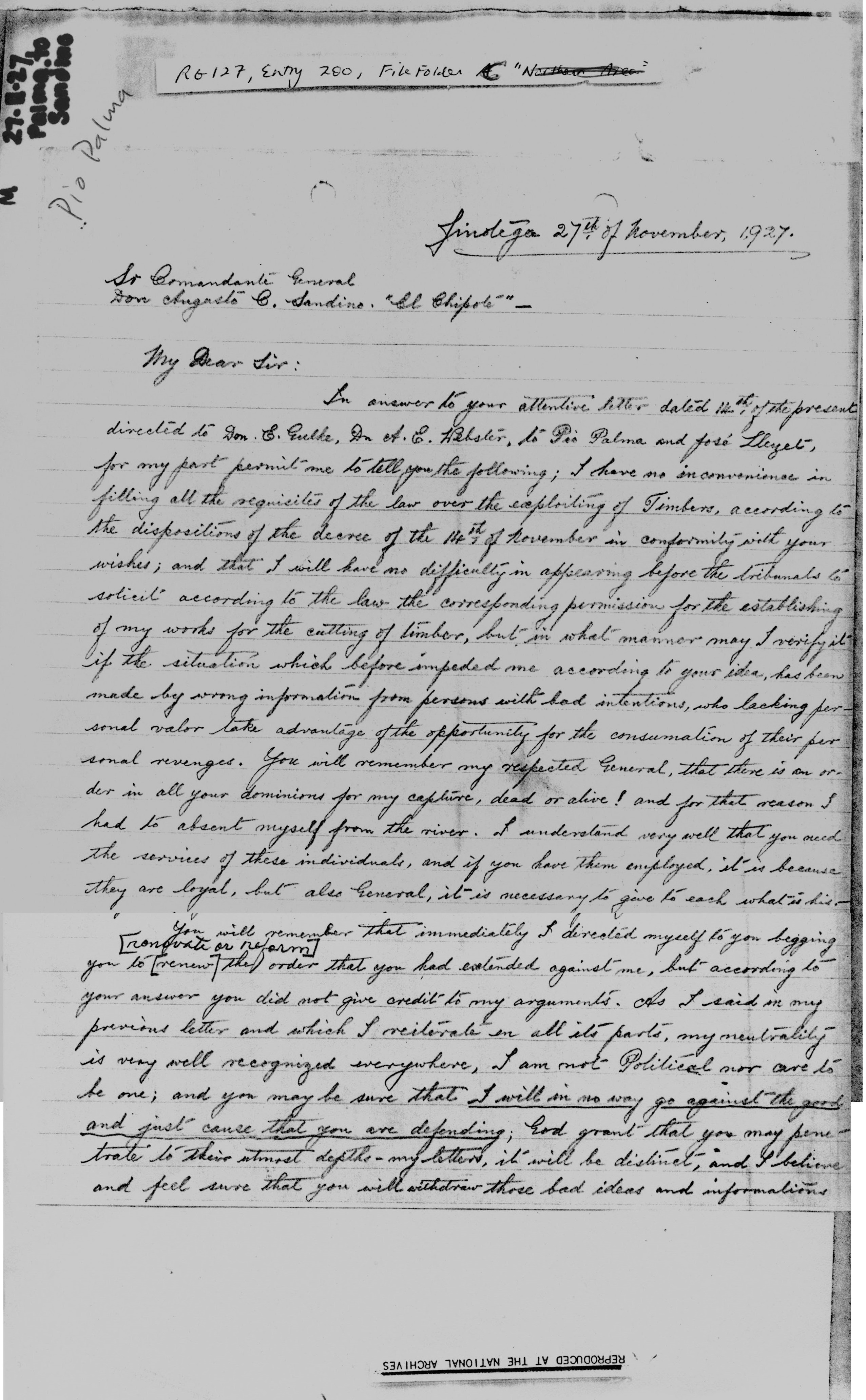 Palma, Jinotega, to Sr. Comandante General Don