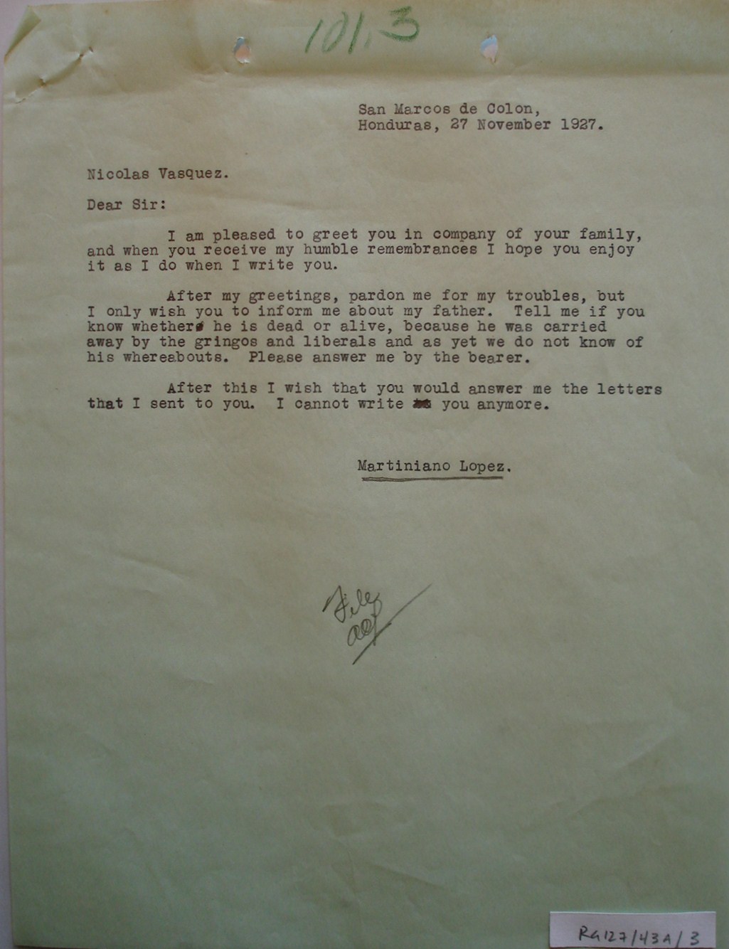Marcos de Colón, Honduras, to Señor Don Nicolás