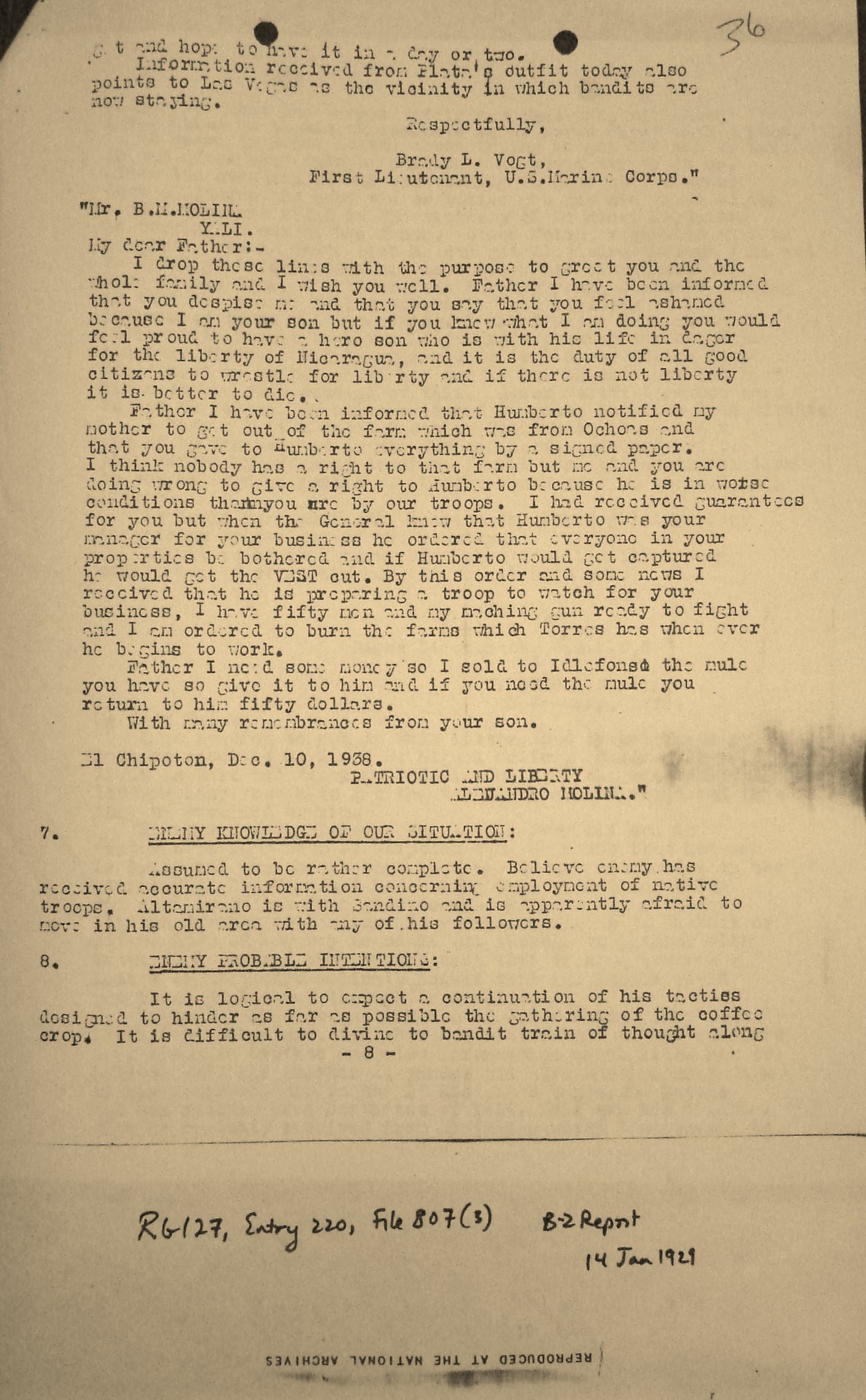 material circumstances and military capabilities; Marine-Guardia efforts to persuade Alejandro Molina to surrender;