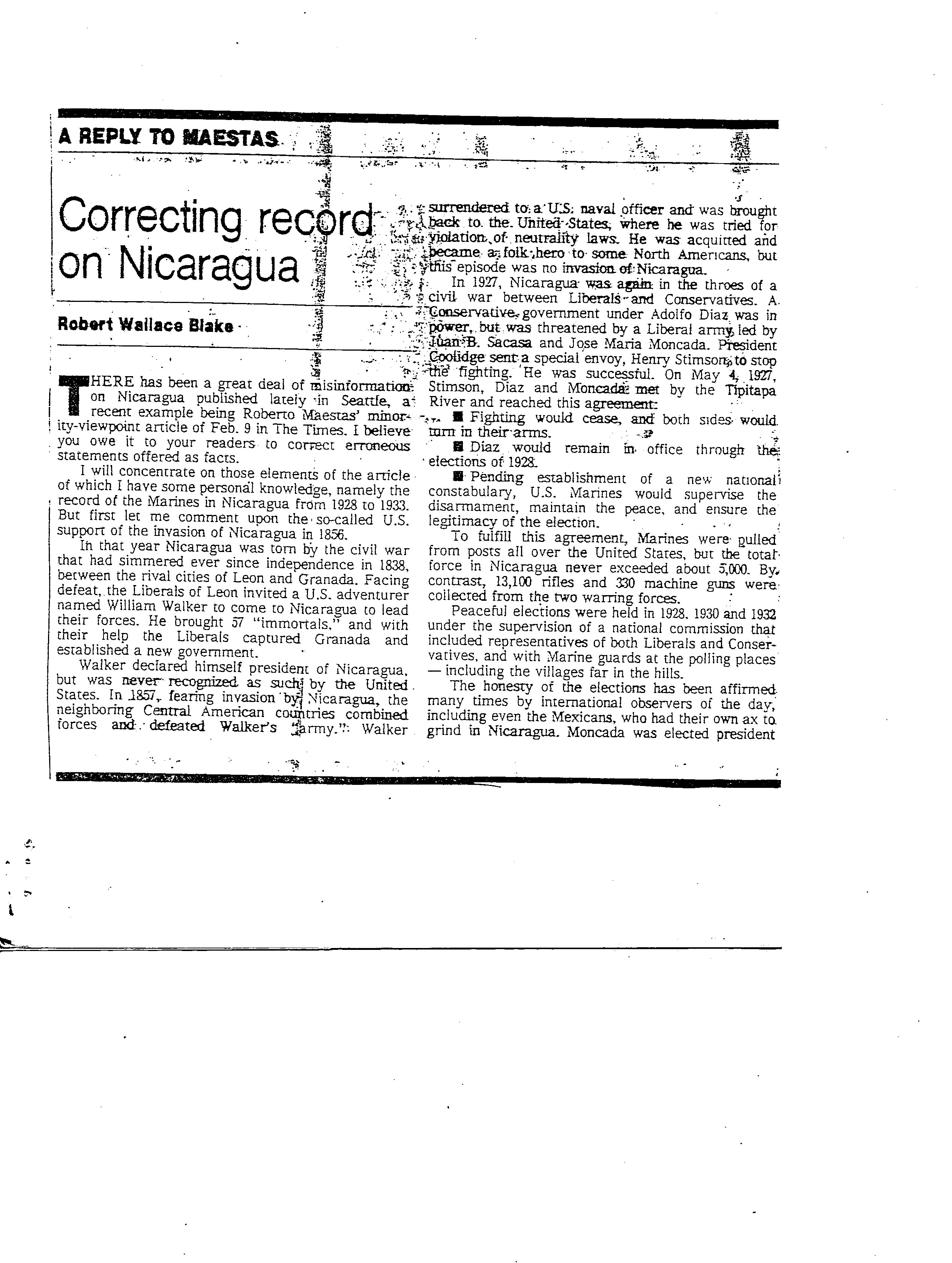 Robert Wallace Blake, "Correcting Record on Nicaragua,"