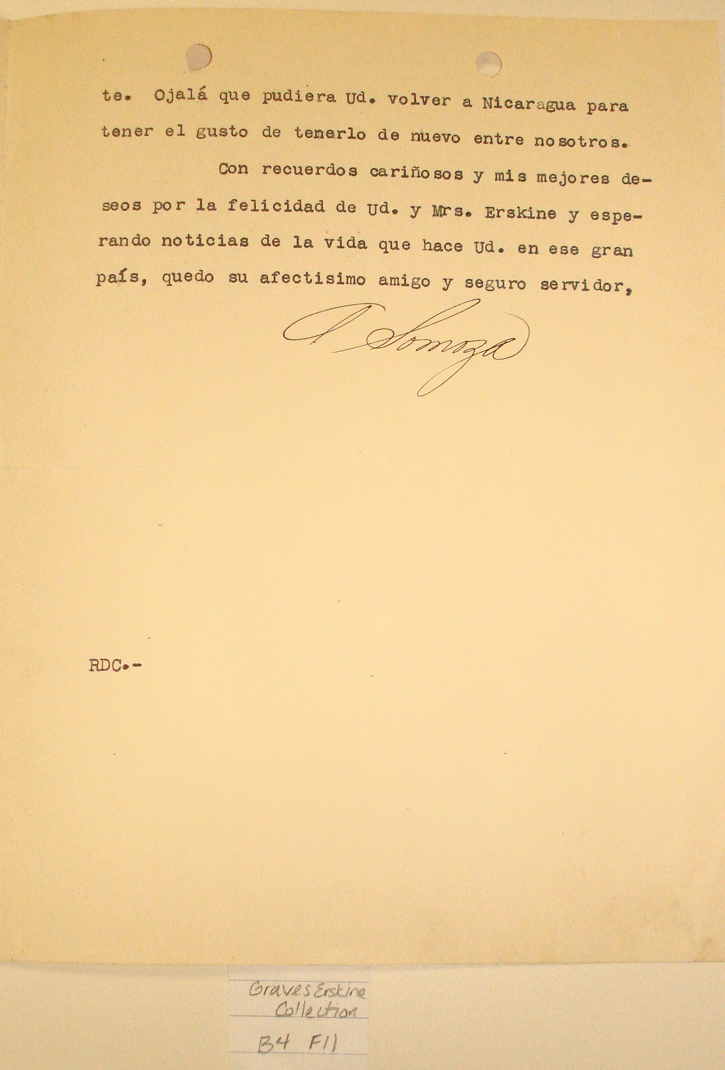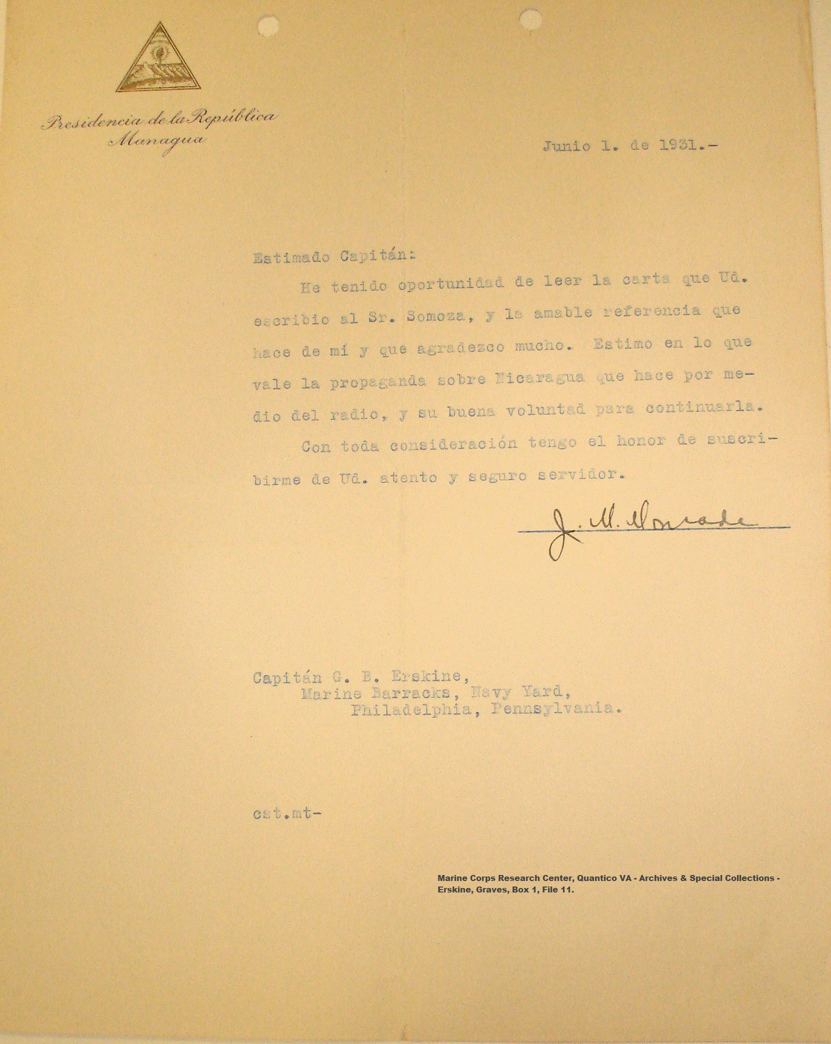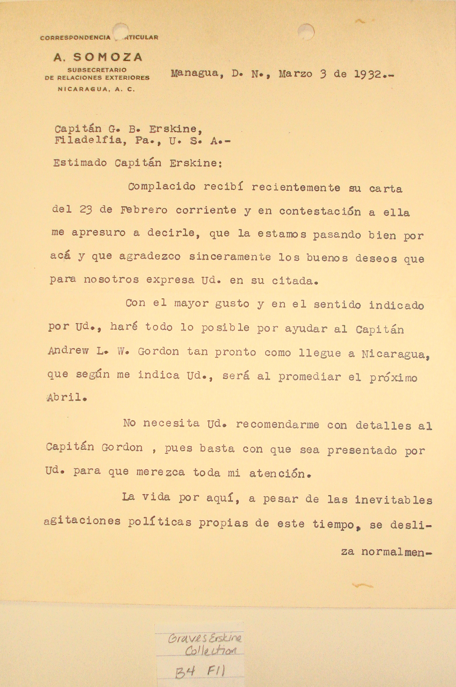 Relaciones Exteriores, Managua, to Capt. G. B. Erskine,